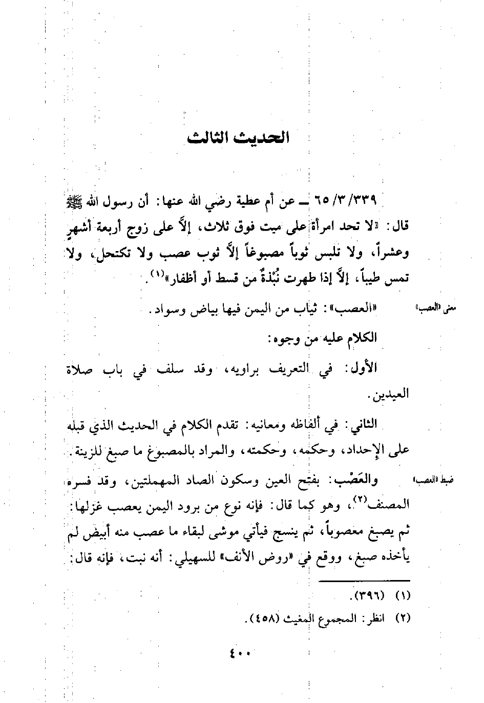 339/ 3/ 65 - عن أم عطية رضي الله عنها: أن رسول الله - صلى الله عليه وسلم - قال: "لا تحد امرأة على ميت فوق ثلاث، إلَّا على زوج أربعة أشهرٍ وعشرًا، ولا تلبس ثوبًا مصبوغًا إلَّا ثوب عصب ولا تكتحل، ولا تمس طيبًا، إلاًّ إذا طهرت نُبْذةٌ من قسط أو أظفار" (¬1).