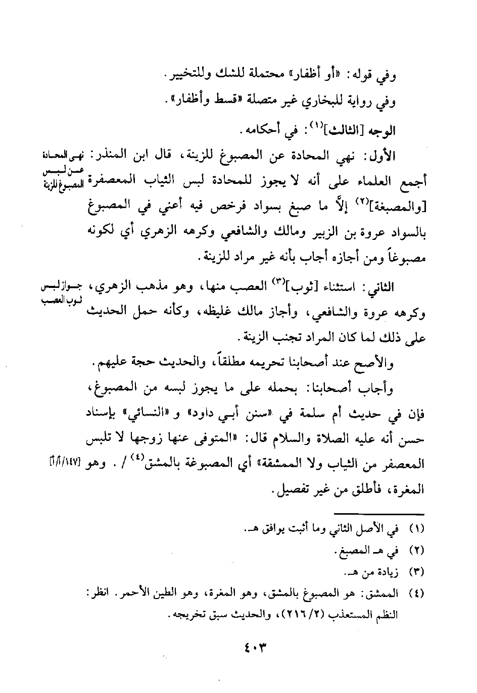 الثاني: استثناء [ثوب] (¬3) العصب منها، وهو مذهب الزهري، وكرهه عروة والشافعي، وأجاز مالك غليظه، وكأنه حمل الحديث على ذلك لما كان المراد تجنب الزينة.