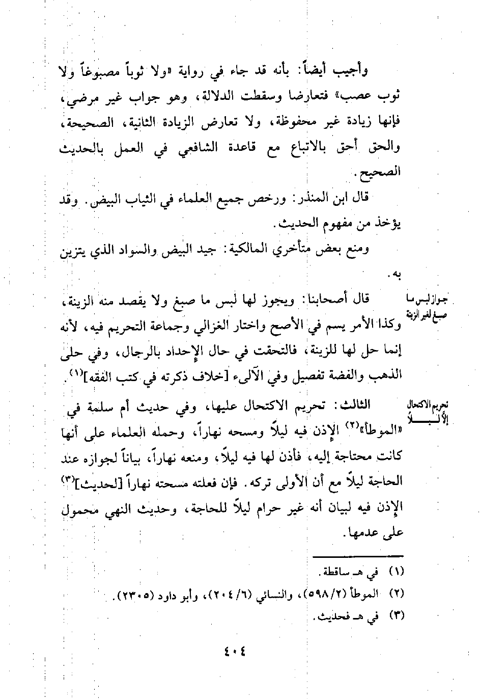 الثالث: تحريم الاكتحال عليها، وفي حديث أم سلمة في "الموطأ" (¬2) الإِذن فيه ليلًا ومسحه نهارًا، وحمله العلماء على أنها كانت محتاجة إليه، فأذن لها فيه ليلًا، ومنعه نهارًا، بيانًا لجوازه عند الحاجة ليلًا مع أن الأولى تركه. فإن فعلته مسحته نهارًا [لحديث] (¬3) الإِذن فيه لبيان أنه غير حرام ليلًا للحاجة، وحديث النهي محمول على عدمها.