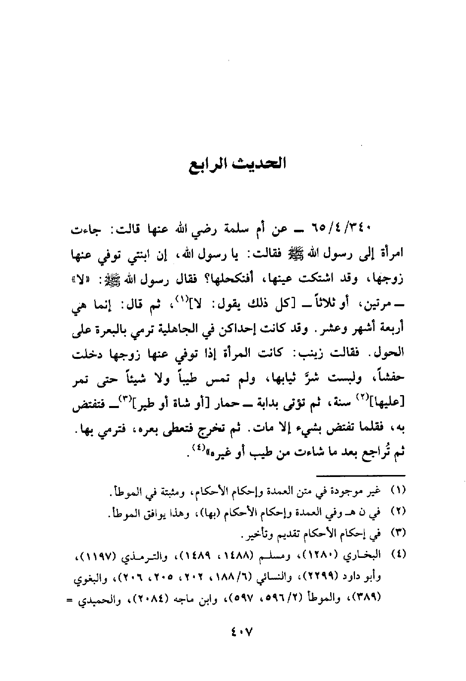 340/ 4/ 65 - عن أم سلمة - رضي الله عنها - قالت: جاءت امرأة إلى رسول الله - صلى الله عليه وسلم - فقالت: يا رسول الله، إن ابنتي توفي عنها زوجها، وقد اشتكت عينها، أفنكحلها؟ فقال رسول الله - صلى الله عليه وسلم: "لا" -مرتين، أو ثلاثًا-[كل ذلك يقول: لا] (¬1)، ثم قال: إنما هي أربعة أشهر وعشر. وقد كانت إحداكن في الجاهلية ترمي بالبعرة على الحول. فقالت زينب: كانت المرأة إذا توفي عنها زوجها دخلت حفشًا، ولبست شرَّ ثيابها ,ولم تمس طيبًا ولا شيئًا حتى تمر [عليها] (¬2) سنة، ثم تؤتى بدابة -حمار [أو شاة أو طير] (¬3) - فتفتض به، فقلما تفتض بشيء إلا مات. ثم تخرج فتعطى بعره، فترمي بها. ثم تُراجع بعد ما شاءت من طيب أو غيره" (¬4).