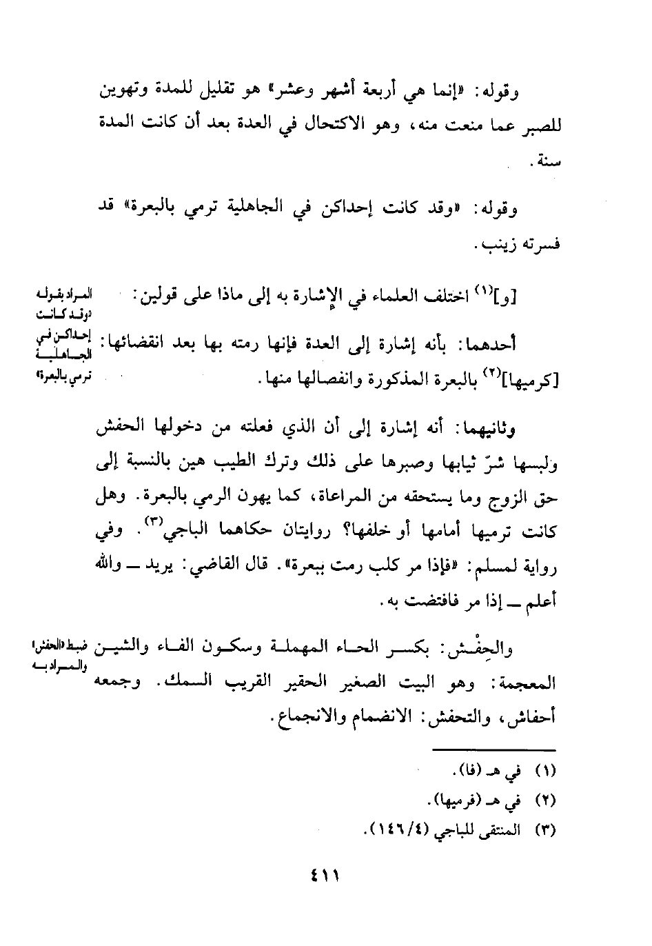 وثانيهما: أنه إشارة إلى أن الذي فعلته من دخولها الحفش ولبسها شرّ ثيابها وصبرها على ذلك وترك الطيب هين بالنسبة إلى حق الزوج وما يستحقه من المراعاة، كما يهون الرمي بالبعرة. وهل كانت ترميها أمامها أو خلفها؟ روايتان حكاهما الباجي (¬3). وفي رواية لمسلم: "فإذا مر كلب رمت ببعرة". قال القاضي: يريد -والله أعلم- إذا مر فافتضت به.