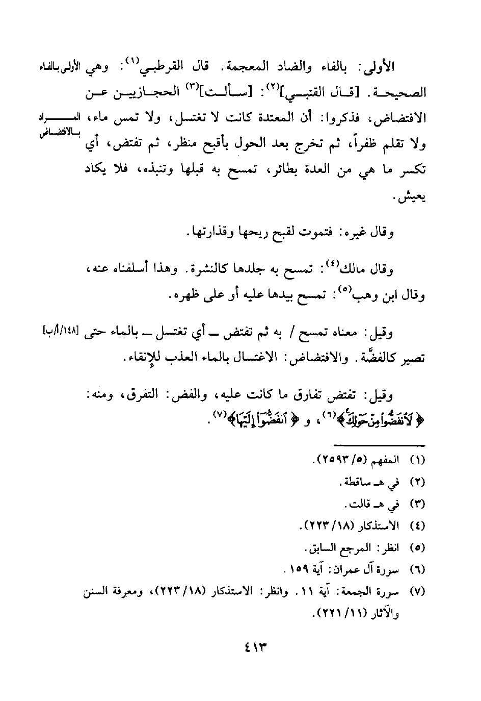 وقيل: معناه تمسح به ثم تفتض -أي تغتسل- بالماء حتى تصير كالفضَّة. والافتضاض: الاغتسال بالماء العذب للإِنقاء.