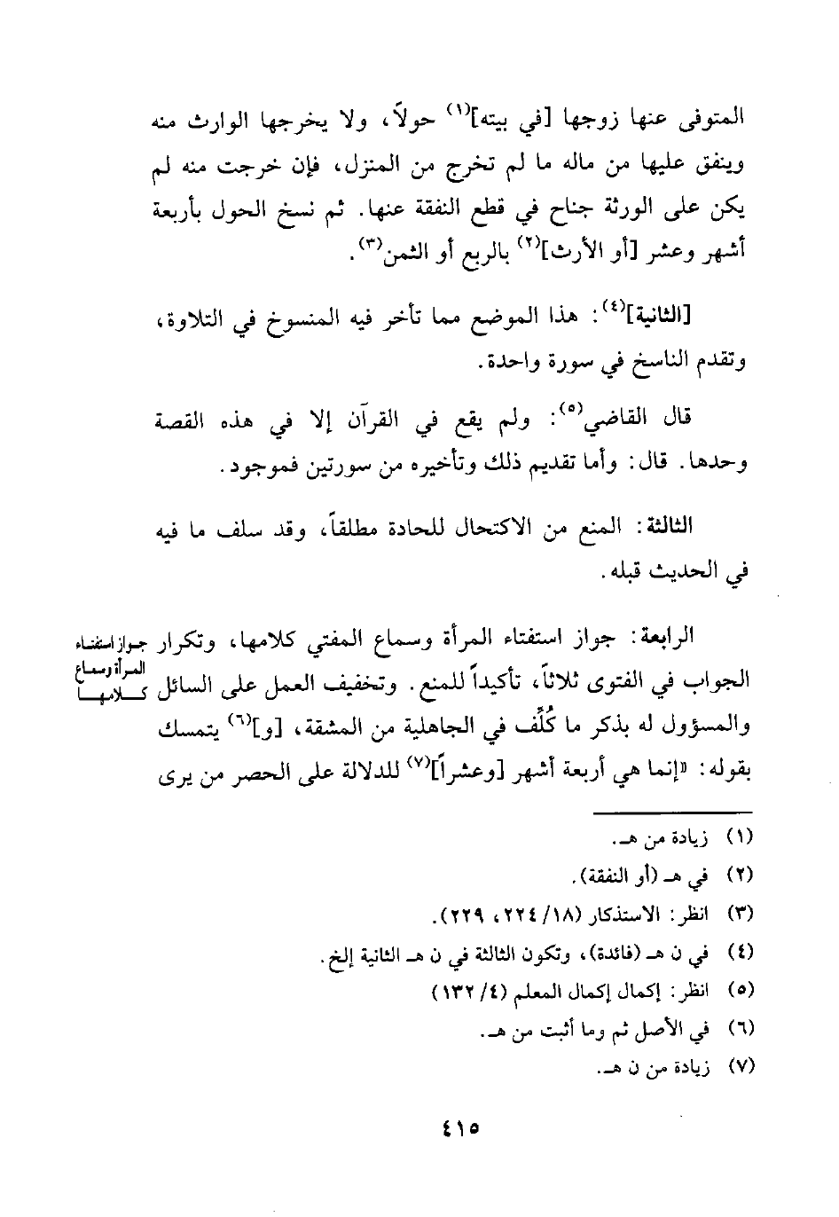 الرابعة: جواز استفتاء المرأة وسماع المفتي كلامها، وتكرار الجواب في الفتوى ثلاثًا، تأكيدًا للمنع. وتخفيف العمل على السائل والمسؤول له بذكر ما كُلف في الجاهلية من المشقة، [و] (¬6) يتمسك بقوله: "إنما هي أربعة أشهر [وعشرًا] (¬7) للدلالة على الحصر من يرى