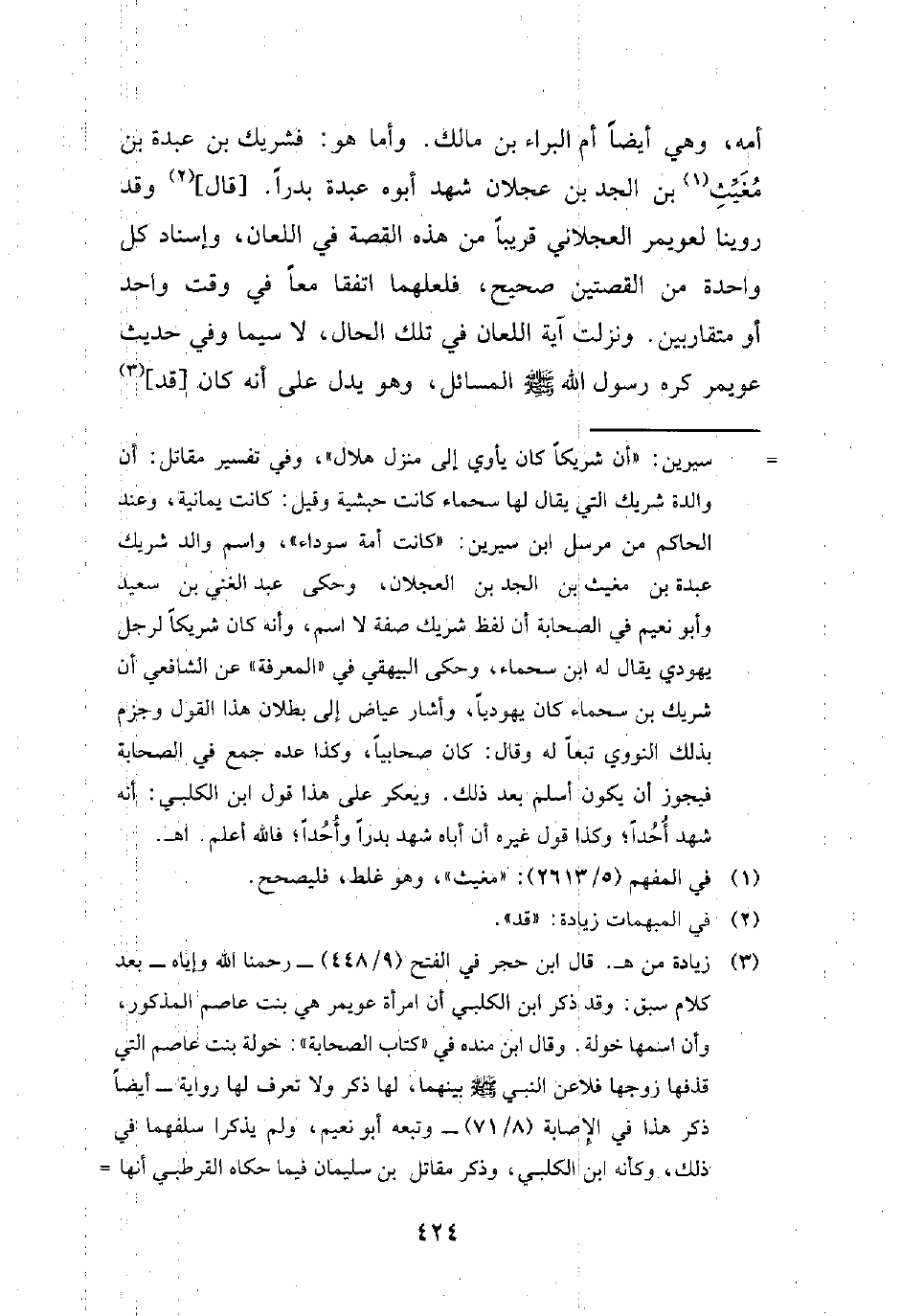 أمه، وهي أيضًا أم البراء بن مالك. وأما هو: فشريك بن عبدة بن مُغَيِّثِ (¬1) بن الجد بن عجلان شهد أبوه عبدة بدرًا. [قال] (¬2) وقد روينا لعويمر العجلاني قريبًا من هذه القصة في اللعان، وإسناد كل واحدة من القصتين صحيح، فلعلهما اتفقا معًا في وقت واحد أو متقاربين. ونزلت آية اللعان في تلك الحال، لاسيما وفي حديث عويمر كره رسول الله - صلى الله عليه وسلم - المسائل، وهو يدل على أنه كان [قد] (¬3)