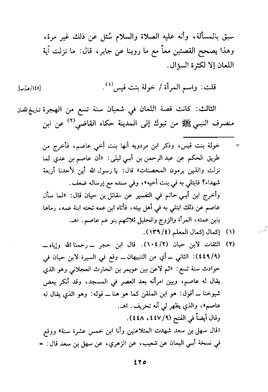 الثالث: كانت قصة اللعان في شعبان سنة تسع من الهجرة منصرف النبي - صلى الله عليه وسلم - من تبوك إلى المدينة حكاه القاضي (¬2) عن ابن