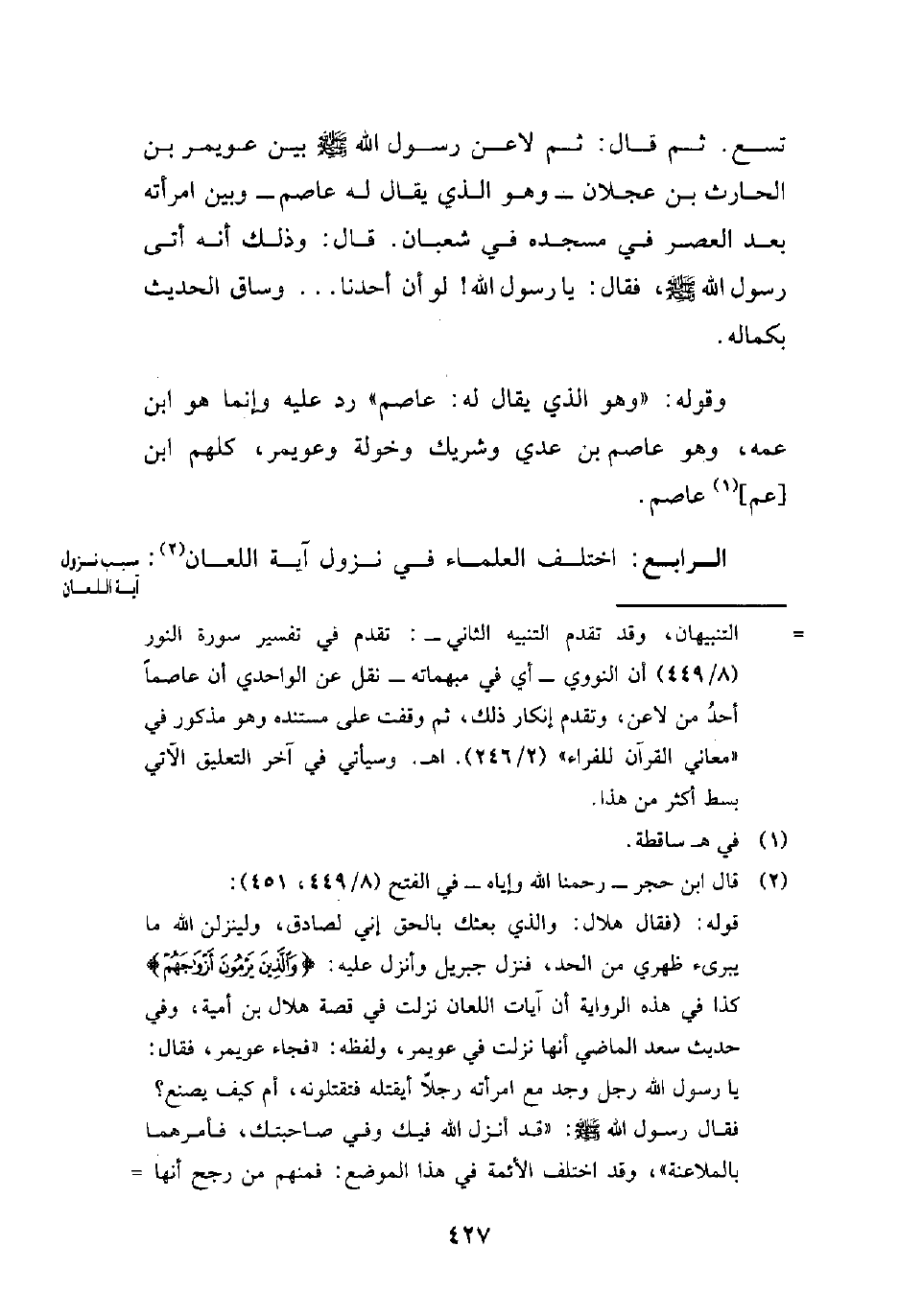= التنبيهان، وقد تقدم التنبيه الثاني-: تقدم في تفسير سورة النور (8/ 449) أن النووي -أي في مبهماته- نقل عن الواحدي أن عاصمًا أحدُ من لاعن، وتقدم إنكار ذلك، ثم وقفت على مستنده وهو مذكور في "معاني القرآن للفراء" (2/ 246). اهـ. وسيأتي في آخر التعليق الآتي بسط أكثر من هذا.