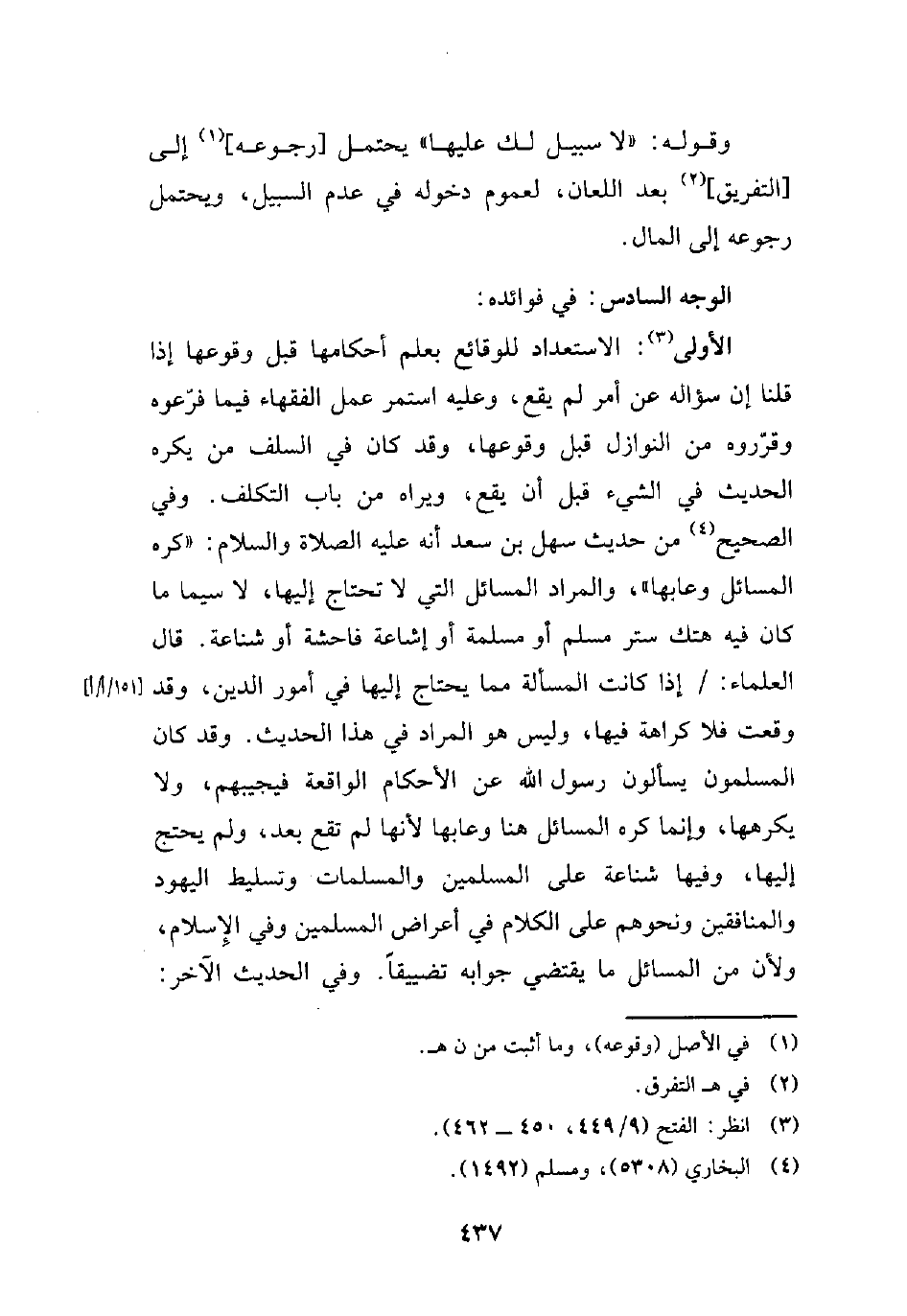 الأولى (¬3): الاستعداد للوقائع بعلم أحكامها قبل وقوعها إذا قلنا إن سؤاله عن أمر لم يقع، وعليه استمر عمل الفقهاء فيما فرّعوه وقرّروه من النوازل قبل وقوعها، وقد كان في السلف من يكره الحديث في الشيء قبل أن يقع، ويراه من باب التكلف. وفي الصحيح (¬4) من حديث سهل بن سعد أنه -عليه الصلاة والسلام-: "كره المسائل وعابها"، والمراد المسائل التي لا تحتاج إليها, لاسيما ما كان فيه هتك ستر مسلم أو مسلمة أو إشاعة فاحشة أو شناعة. قال العلماء: إذا كانت المسألة مما يحتاج إليها في أمور الدين، وقد وقعت فلا كراهة فيها , وليس هو المراد في هذا الحديث. وقد كان المسلمون يسألون رسول الله عن الأحكام الواقعة فيجيبهم، ولا يكرهها، وإنما كره المسائل هنا وعابها لأنها لم تقع بعد، ولم يحتج إليها، وفيها شناعة على المسلمين والمسلمات وتسليط اليهود والمنافقين ونحوهم على الكلام في أعراض المسلمين وفي الإِسلام، ولأن من المسائل ما يقتضي جوابه تضييقًا. وفي الحديث الآخر: