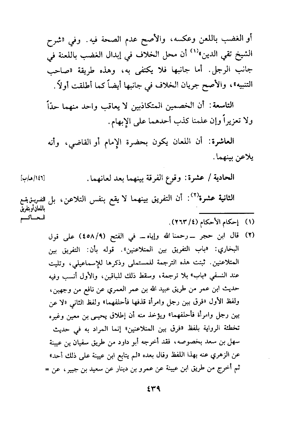 (¬2) قال ابن حجر -رحمنا الله وإياه- في الفتح (9/ 458) على قول البخاري: "باب التفربق بين المتلاعنين". قوله بأن: التفريق بين المتلاعنين. ثبتت هذه الترجمة للمستملى وذكرها للإسماعيلي، وتليت عند النسفي "باب" بلا ترجمة، وسقط ذلك للباقين، والأول أنسب وفيه حديث ابن عمر من طريق عبيد الله بن عمر العمري عن نافع من وجهين، ولفظ الأول "فرق بين رجل وامرأة قذفها فأحلفهما" ولفظ الثاني "لاعن بين رجل وامرأة فأحلفهما" ويؤخذ منه أن إطلاق يحيى بن معين وغيره تخطئة الرواية بلفظ "فرق بين المتلاعنين" إنما المراد به في حديث سهل بن سعد بخصوصه، فقد أخرجه أبو داود من طريق سفيان بن عيينة عن الزهري عنه بهذا اللفظ وقال بعده "لم يتابع ابن عيينة على ذلك أحد" ثم أخرج من طريق ابن عيينة عن عمرو بن دينار عن سعيد بن جبير، عن =
