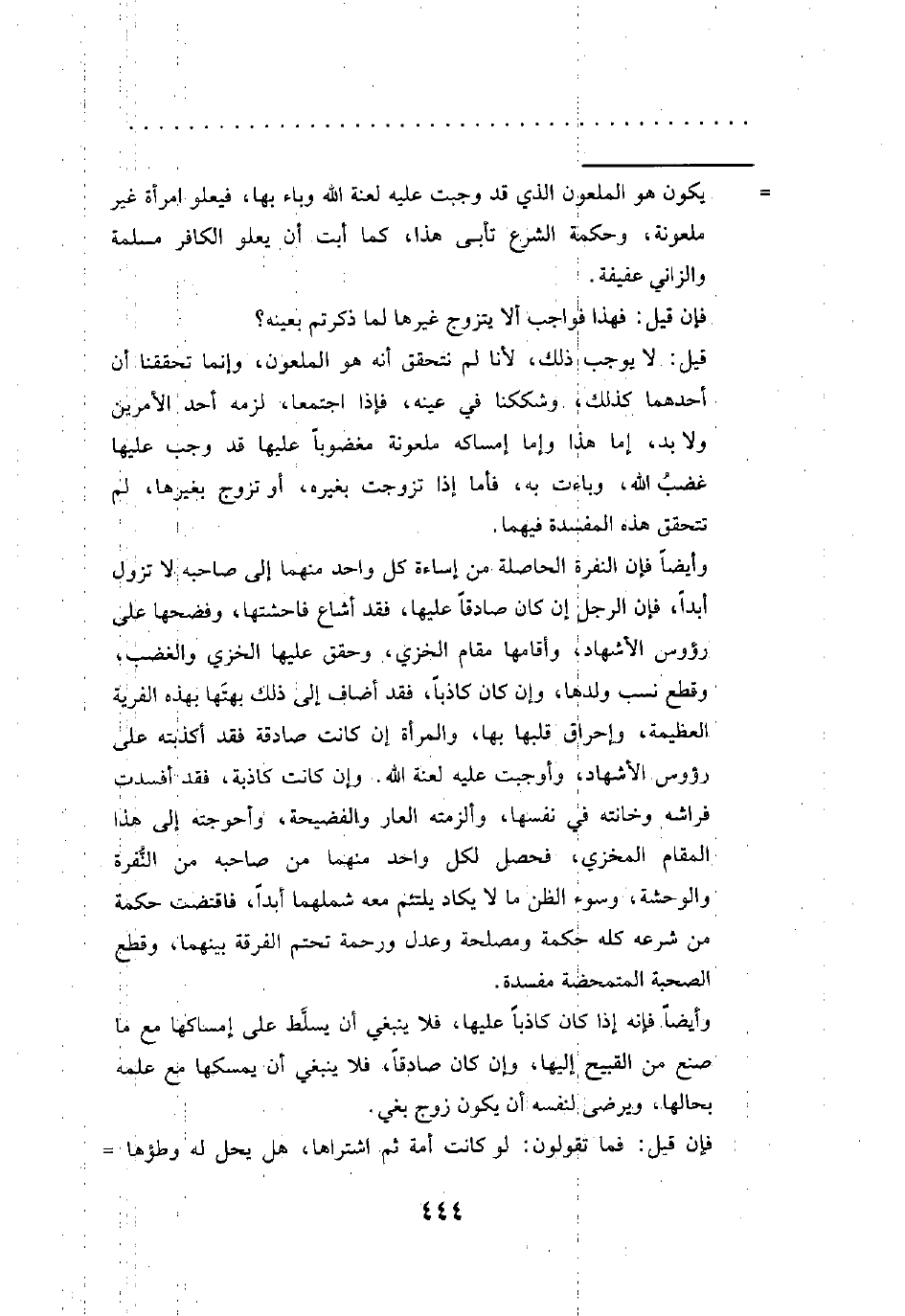 قيل: لا يوجب ذلك، لأنا لم نتحقق أنه هو الملعون، وإنما تحققنا أن أحدهما كذلك، وشككنا في عينه، فإذا اجتمعا، لزمه أحد الأمرين ولابد، إما هذا وإما إمساكه ملعونة مغضوبًا عليها قد وجب عليها غضبُ الله، وباءت به، فأما إذا تزوجت بغيره، أو تزوج بغيرها، لم تتحقق هذه المفسدة فيهما.