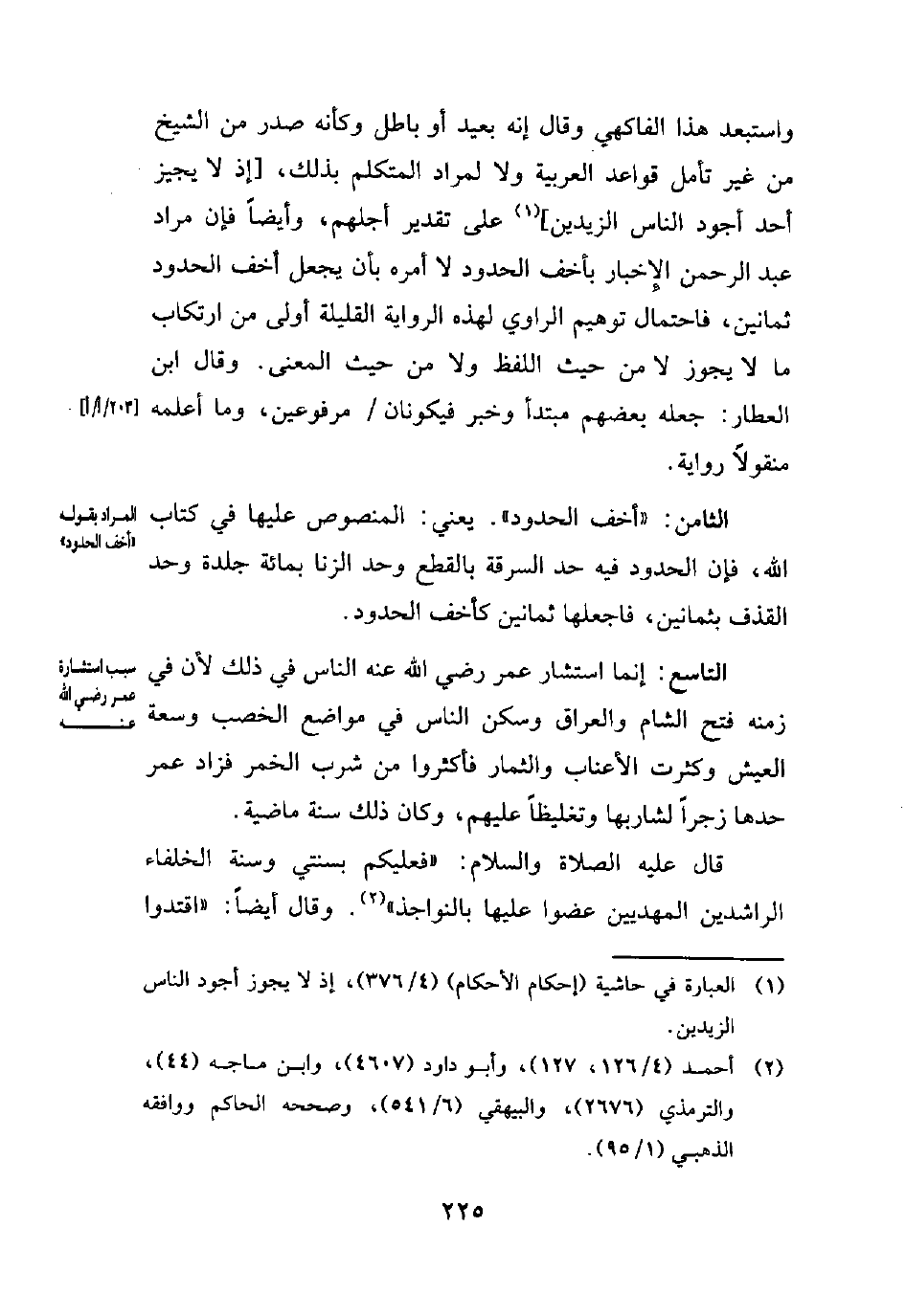واستبعد هذا الفاكهي وقال إنه بعيد أو باطل وكأنه صدر من الشيخ من غير تأمل قواعد العربية ولا لمراد المتكلم بذلك، [إذ لا يجيز أحد أجود الناس الزيدين] (¬1) على تقدير أجلهم، وأيضًا فإن مراد عبد الرحمن الإِخبار بأخف الحدود لا أمره بأن يجعل أخف الحدود ثمانين، فاحتمال توهيم الراوي لهذه الرواية القليلة أولى من ارتكاب ما لا يجوز لا من حيث اللفظ ولا من حيث المعنى. وقال ابن العطار: جعله بعضهم مبتدأ وخبر فيكونان مرفوعين، وما أعلمه منقولًا رواية.