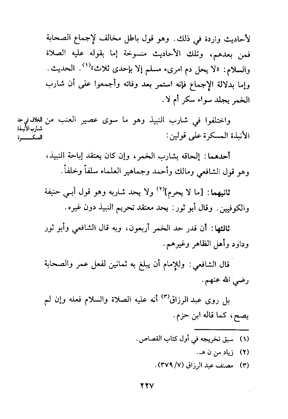 لأحاديث واردة في ذلك. وهو قول باطل مخالف لإِجماع الصحابة فمن بعدهم، وتلك الأحاديث منسوخة إما بقوله -عليه الصلاة والسلام-: "لا يحل دم امرئ مسلم إلا بإحدى ثلاث" (¬1). الحديث. وإما بدلالة الإِجماع فإنه استمر بعد وفاته وأجمعوا على أن شارب الخمر يجلد سواء سكر أم لا.