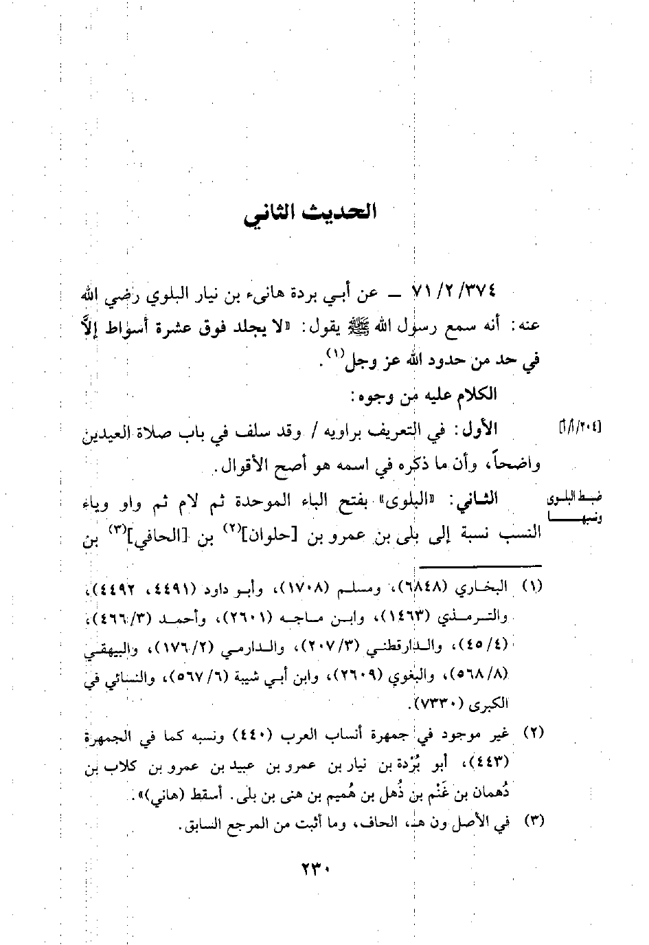 374/ 2/ 71 - عن أبي بردة هانئ بن نيار البلوي - رضي الله عنه -: أنه سمع رسول الله - صلي الله عليه وسلم - يقول: "لا يجلد فوق عشرة أسواط إلَّا في حد من حدود الله عَزَّ وَجَلَّ (¬1).