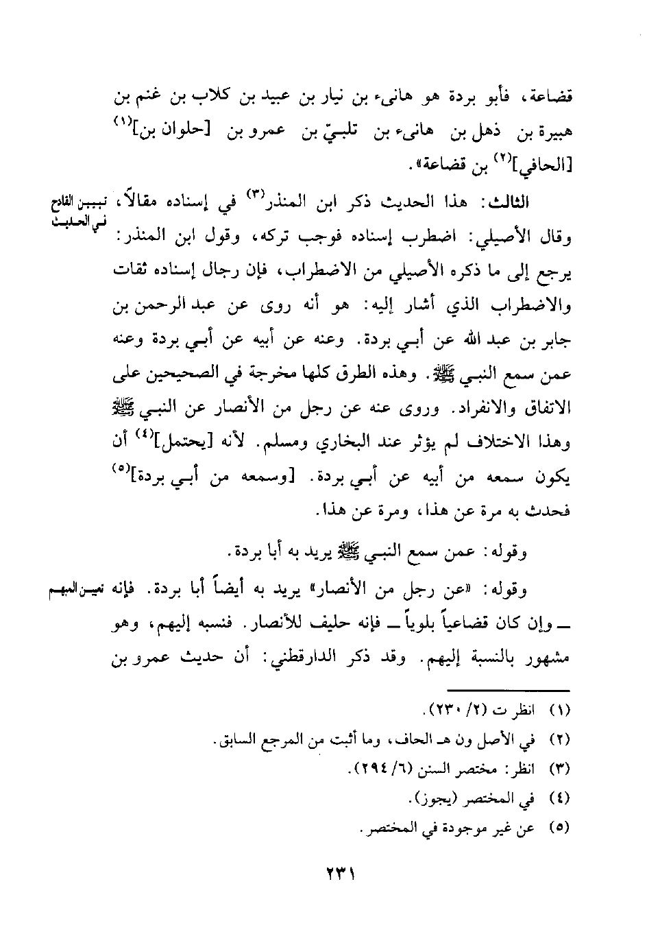 الثالث: هذا الحديث ذكر ابن المنذر (¬3) في إسناده مقالًا، وقال الأصيلي: اضطرب إسناده فوجب تركه، وقول ابن المنذر: يرجع إلى ما ذكره الأصيلي من الاضطراب، فإن رجال إسناده ثقات والاضطراب الذي أشار إليه: هو أنه روى عن عبد الرحمن بن جابر بن عبد الله عن أبي بردة. وعنه عن أبيه عن أبي بردة وعنه عمن سمع النبي - صلي الله عليه وسلم -. وهذه الطرق كلها مخرجة في الصحيحين على الاتفاق والانفراد. وروى عنه عن رجل من الأنصار عن النبي - صلي الله عليه وسلم - وهذا الاختلاف لم يؤثر عند البخاري ومسلم. لأنه [يحتمل] (¬4) أن يكون سمعه من أبيه عن أبي بردة. [وسمعه من أبي بردة] (¬5) فحدث به مرة عن هذا، ومرة عن هذا.