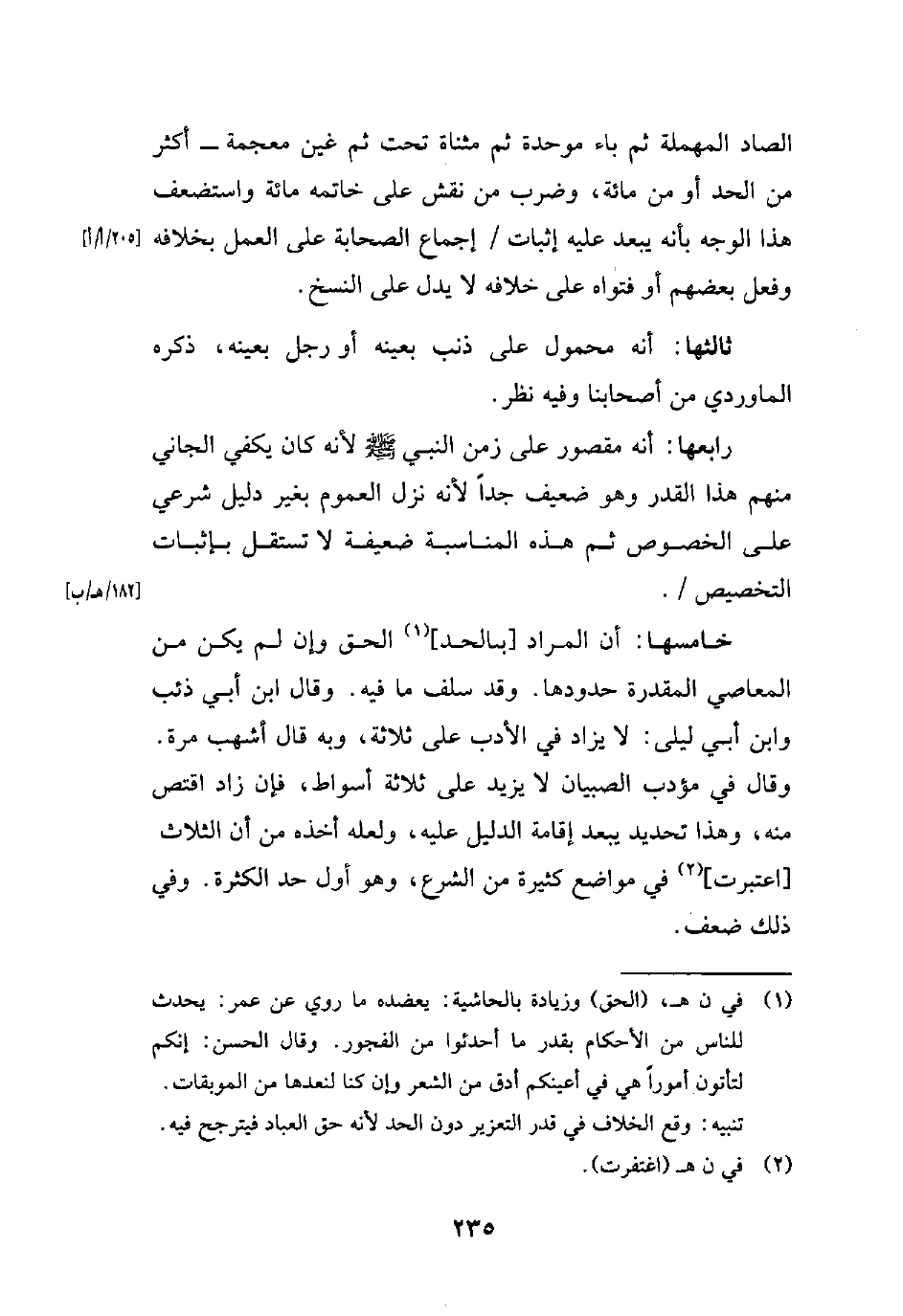 الصاد المهملة ثم باء موحدة ثم مثناة تحت ثم غين معجمة- أكثر من الحد أو من مائة، وضرب من نقش على خاتمه مائة واستضعف هذا الوجه بأنه يبعد عليه إثبات إجماع الصحابة على العمل بخلافه وفعل بعضهم أو فتواه على خلافه لا يدل على النسخ.