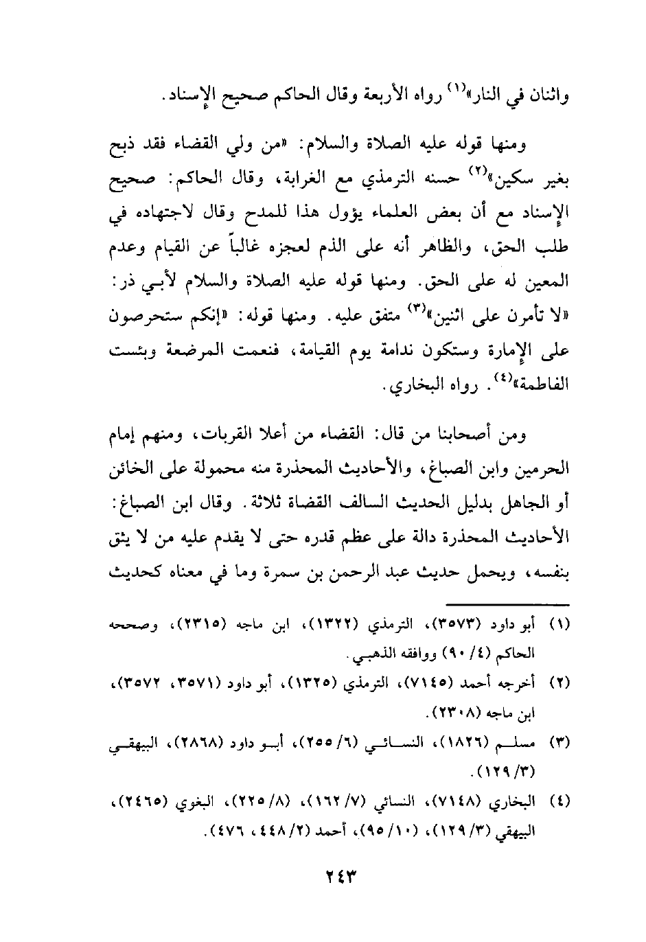 ومنها قوله -عليه الصلاة والسلام-: "من ولي القضاء فقد ذبح بغير سكين" (¬2) حسنه الترمذي مع الغرابة، وقال الحاكم: صحيح الإِسناد مع أن بعض العلماء يؤول هذا للمدح وقال لاجتهاده في طلب الحق، والظاهر أنه على الذم لعجزه غالبًا عن القيام وعدم المعين له على الحق. ومنها قوله -عليه الصلاة والسلام- لأبي ذر: "لا تأمرن على اثنين" (¬3) متفق عليه. ومنها قوله: "إنكم ستحرصون على الإِمارة وستكون ندامة يوم القيامة، فنعمت المرضعة وبئست الفاطمة" (¬4). رواه البخاري.