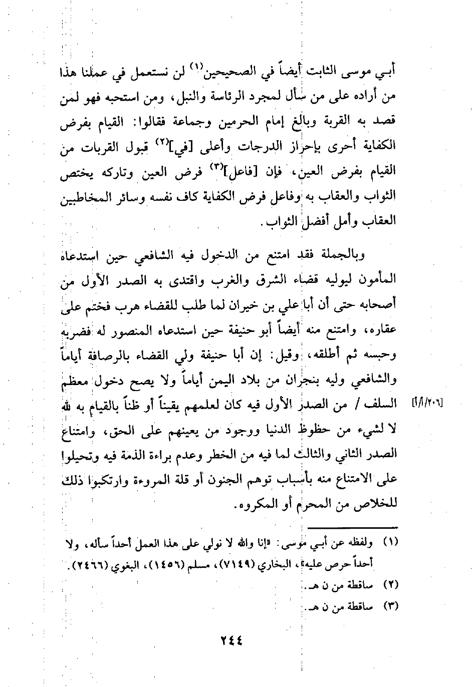(¬1) ولفظه عن أبي موسى: "إنا والله لا نولي على هذا العمل أحدًا سأله، ولا أحدًا حرص عليه"، البخاري (7149)، مسلم (1456)، البغوي (2466).