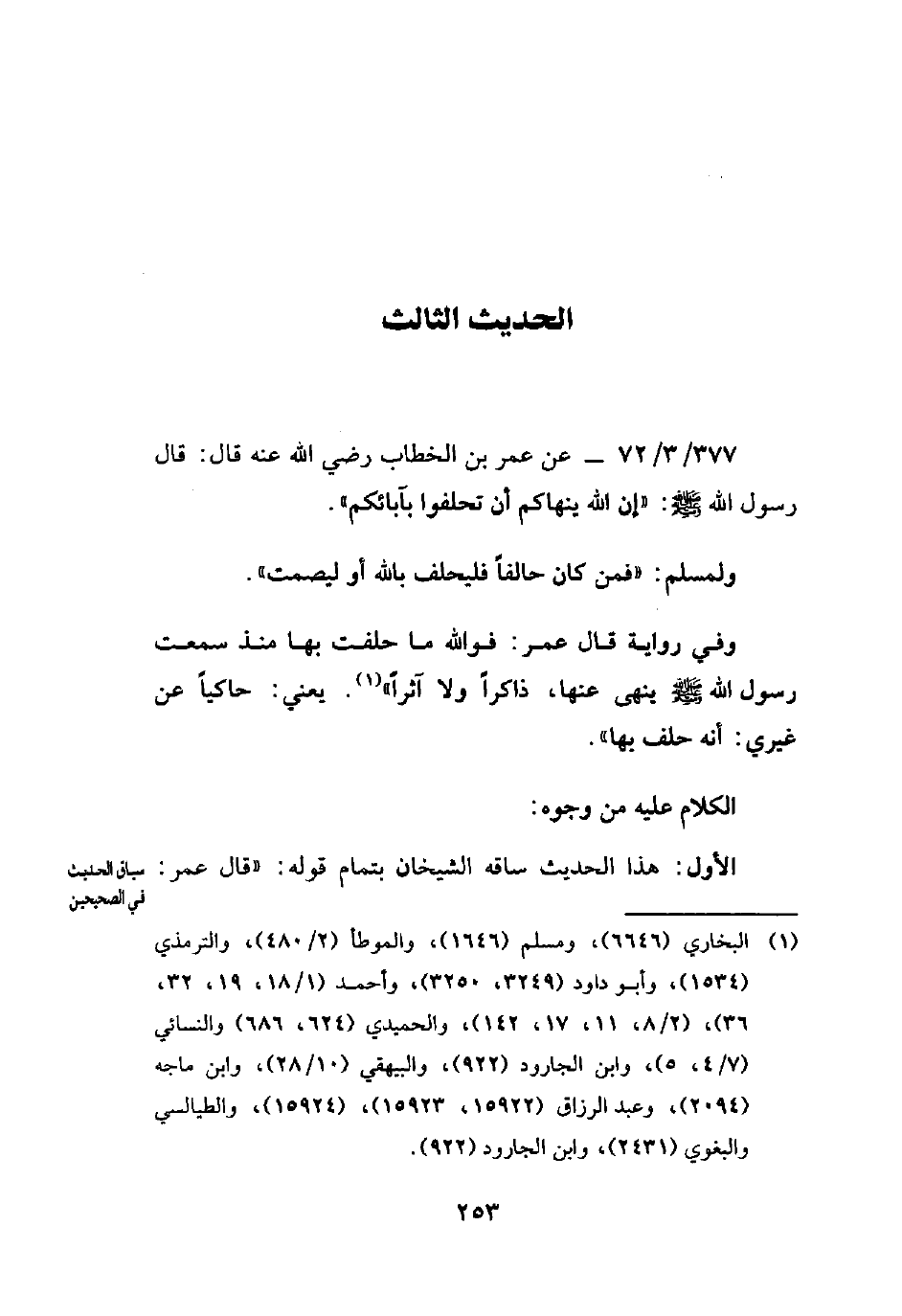 377/ 3/ 72 - عن عمر بن الخطاب - رضي الله عنه - قال: قال رسول الله - صلي الله عليه وسلم -: "إن الله ينهاكم أن تحلفوا بآبائكم".