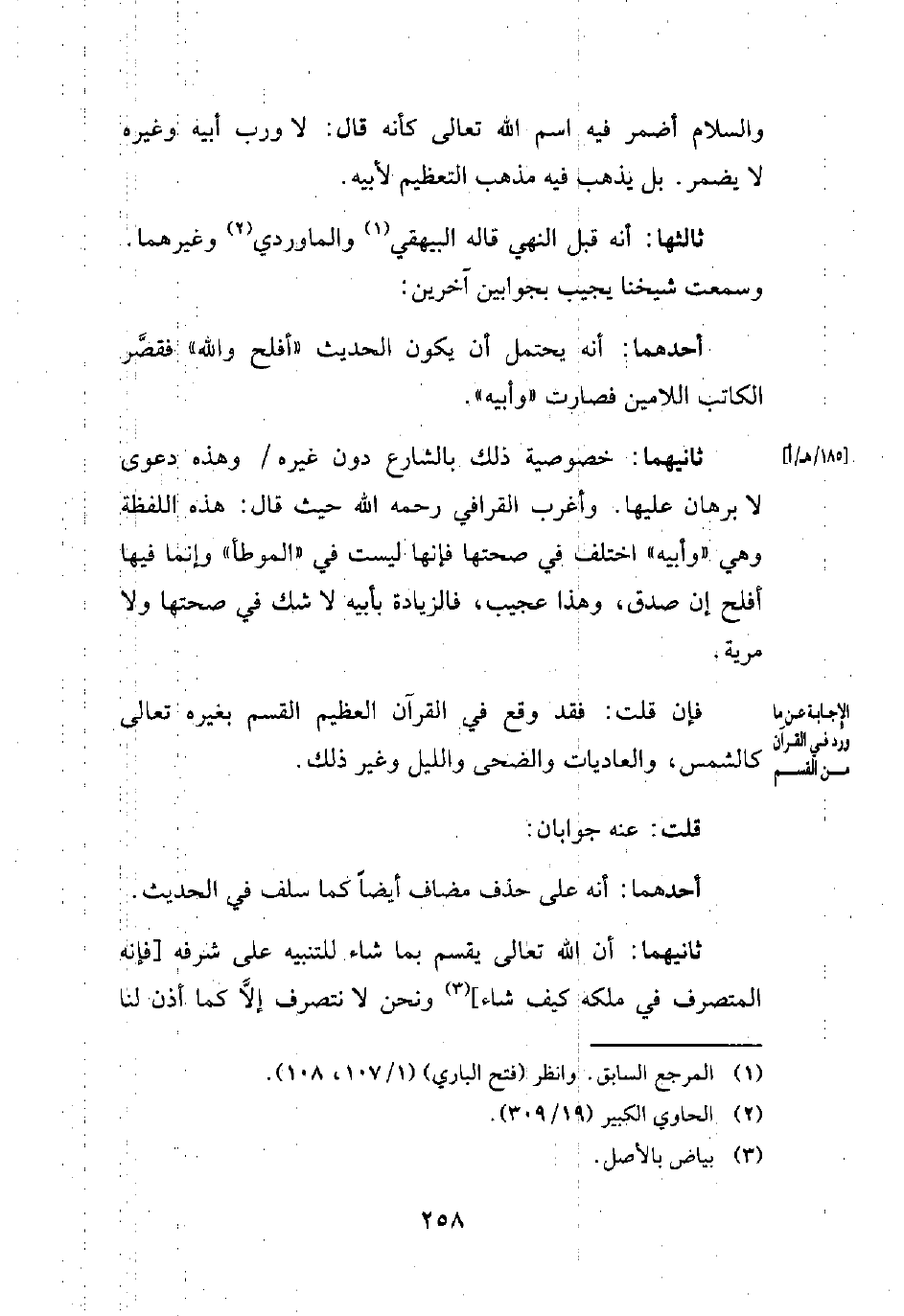 ثانيهما: خصوصية ذلك بالشارع دون غيره وهذه دعوى لا برهان عليها. وأغرب القرافي -رحمه الله- حيث قال: هذه اللفظة وهي "وأبيه" اختلف في صحتها فإنها ليست في "الموطأ" وإنما فيها أفلح إن صدق، وهذا عجيب، فالزيادة بأبيه لا شك في صحتها ولا مرية.