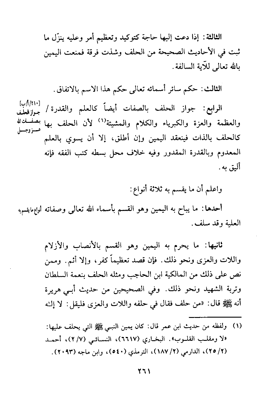الرابع: جواز الحلف بالصفات أيضًا كالعلم والقدرة والعظمة والعزة والكبرياء والكلام والمشيئة (¬1) لأن الحلف بها كالحلف بالذات فينعقد اليمين وإن أطلق، إلا أن يسوي بالعلم المعدوم وبالقدرة المقدور وفيه خلاف محل بسطه كتب الفقه فإنه أليق به.