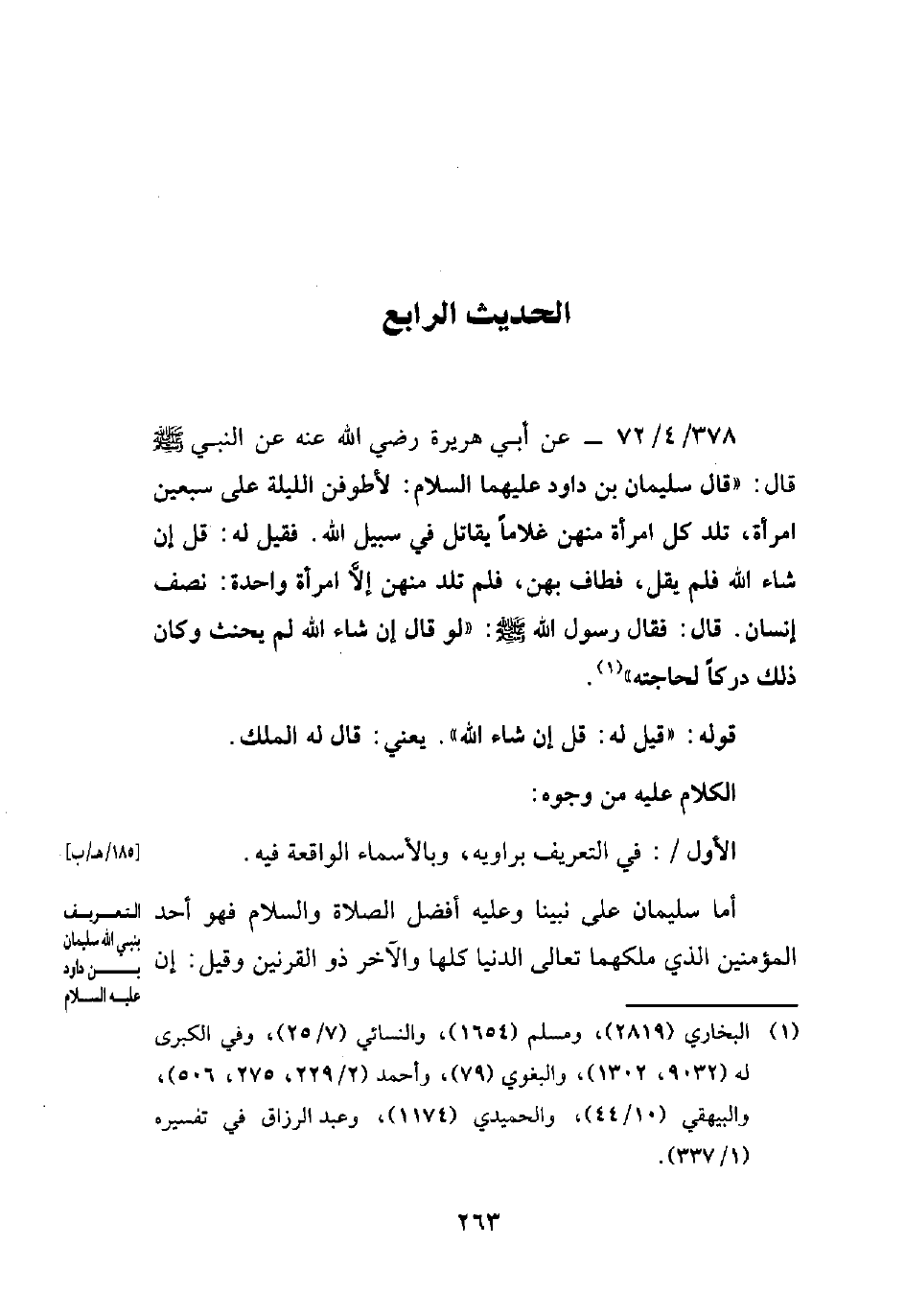 378/ 4/ 72 - عن أبي هريرة - رضي الله عنه - عن النبي - صلي الله عليه وسلم - قال: "قال سليمان بن داود -عليهما السلام-: لأطوفن الليلة على سبعين امرأة، تلد كل امرأة منهن غلامًا يقاتل في سبيل الله. فقيل له: قل إن شاء الله فلم يقل, فطاف بهن، فلم تلد منهن إلَّا امرأة واحدة: نصف إنسان. قال: فقال رسول الله - صلي الله عليه وسلم -: "لو قال إن شاء الله لم يحنث وكان ذلك دركًا لحاجته" (¬1).