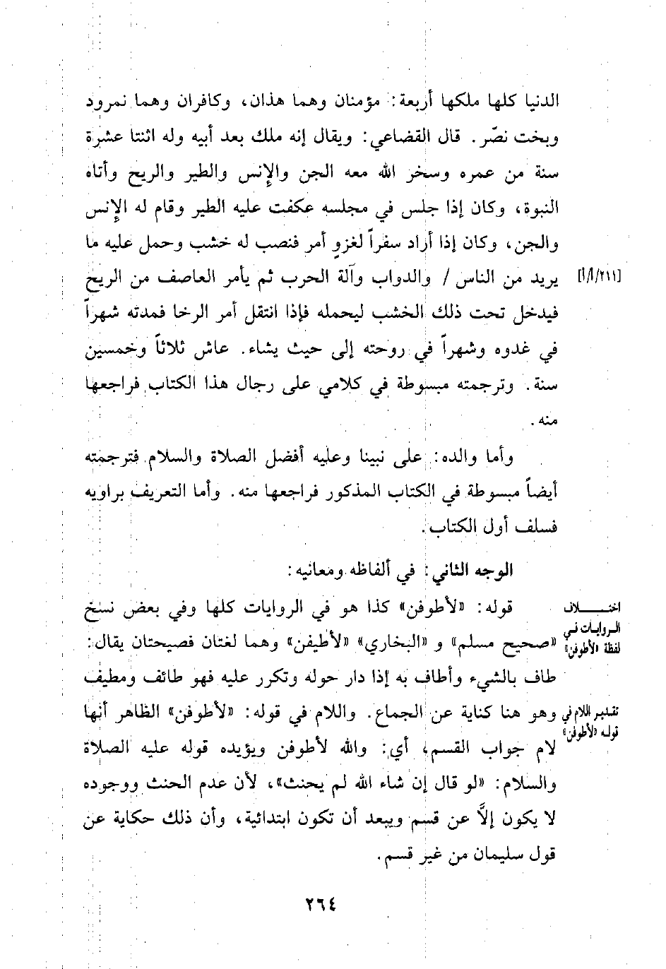 الدنيا كلها ملكها أربعة: مؤمنان وهما هذان، وكافران وهما نمرود وبخت نصّر. قال القضاعي: ويقال إنه ملك بعد أبيه وله اثنتا عشرة سنة من عمره وسخر الله معه الجن والإِنس والطير والريح وأتاه النبوة، وكان إذا جلس في مجلسه عكفت عليه الطير وقام له الإِنس والجن، وكان إذا أراد سفرًا لغزوٍ أمر فنصب له خشب وحمل عليه ما يريد من الناس والدواب وآلة الحرب ثم يأمر العاصف من الريح فيدخل تحت ذلك الخشب ليحمله فإذا انتقل أمر الرخا فمدته شهرًا في غدوه وشهرًا في روحته إلى حيث يشاء. عاش ثلاثًا وخمسين سنة. وترجمته مبسوطة في كلامي على رجال هذا الكتاب فراجعها منه.