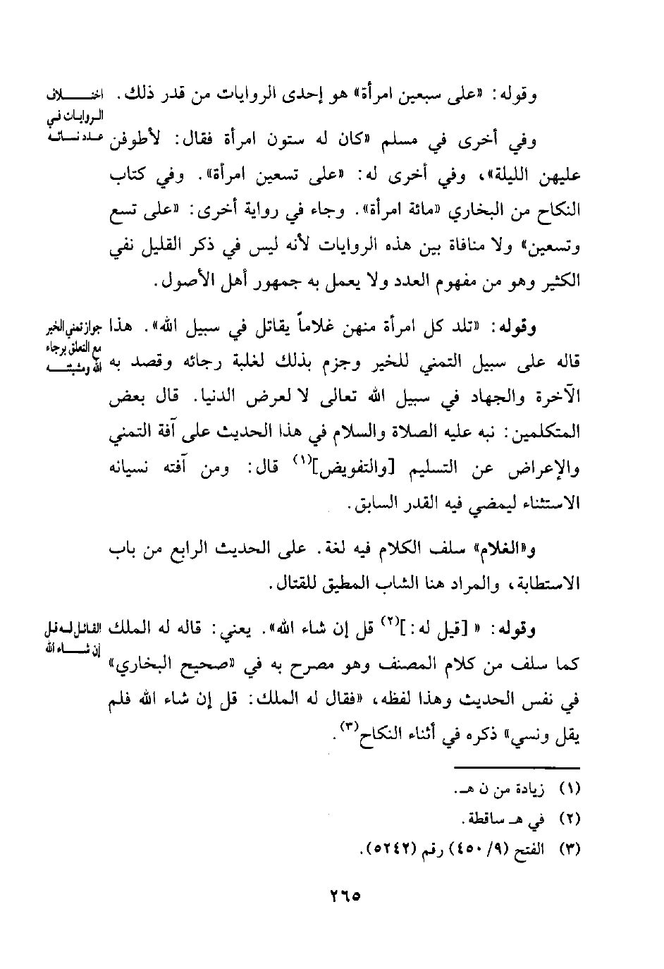 وفي أخرى في مسلم "كان له ستون امرأة فقال: لأطوفن عليهن الليلة"، وفي أخرى له: "على تسعين امرأة". وفي كتاب النكاح من البخاري "مائة امرأة". وجاء في رواية أخرى: "على تسع وتسعين" ولا منافاة بين هذه الروايات لأنه ليس في ذكر القليل نفي الكثير وهو من مفهوم العدد ولا يعمل به جمهور أهل الأصول.