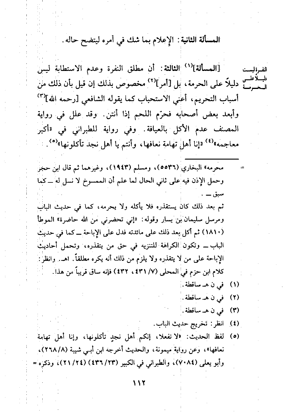 (¬5) لفظ الحديث: "لا تفعلا، إنكم أهل نجدٍ تأكلونها، وإنا أهل تهامة نعافها"، وعن رواية ميمونة، والحديث أخرجه ابن أبي شيبة (8/ 268)، وأبو يعلى (7084) , والطبراني في الكبير (23/ 436) (24/ 21)، وذكره =