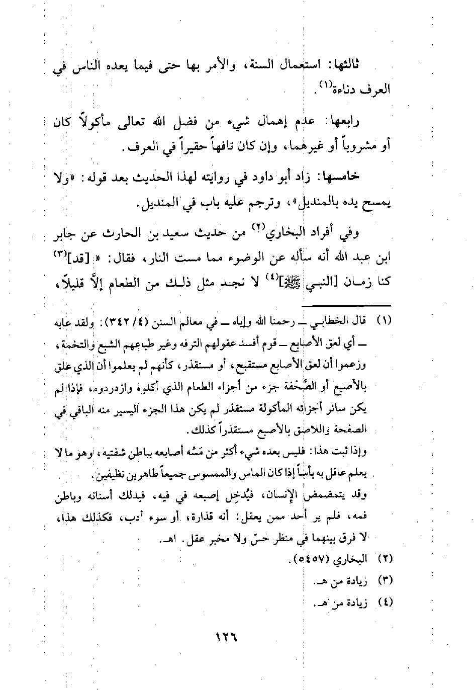 (¬1) قال الخطابي -رحمنا الله وإياه- في معالم السنن (4/ 342): ولقد عابه -أي لعق الأصابع- قوم أفسد عقولهم الترفه وغير طباعهم الشبع والتخمة، وزعموا أن لعق الأصابع مستقبح، أو مستقذر، كأنهم لم يعلموا أن الذي علق بالأصبع أو الصَّحْفة جزء من أجزاء الطعام الذي أكلوه وازدردوه، فإذا لم يكن سائر أجزائه الماكولة مستقذر يكن هذا الجزء اليسير منه الباقي في الصفحة واللاصق بالأصبع مستقذرًا كذلك.