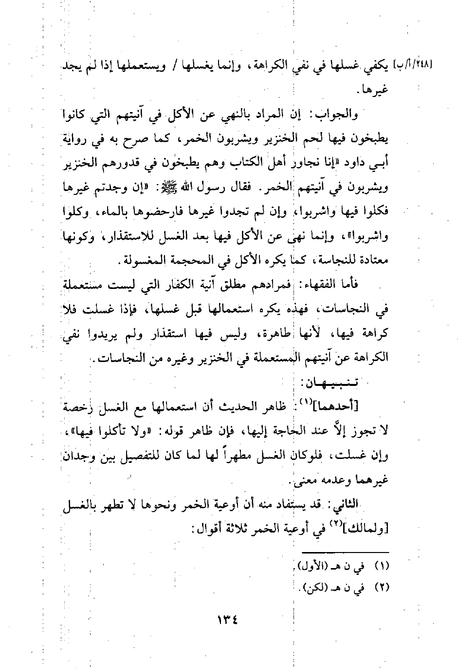 أبي داود "إنا نجاور أهل الكتاب وهم يطبخود في قدورهم الخنزير ويشربون في آنيتهم الخمر. فقال رسول الله - صلي الله عليه وسلم -: "إن وجدتم غيرها فكلوا فيها واشربوا، وإن لم تجدوا غيرها فارحضوها بالماء، وكلوا واشربوا"، وإنما نهى عن الأكل فيها بعد الغسل للاستقذار، وكونها معتادة للنجاسة، كما يكره الأكل في المحجمة المغسولة.