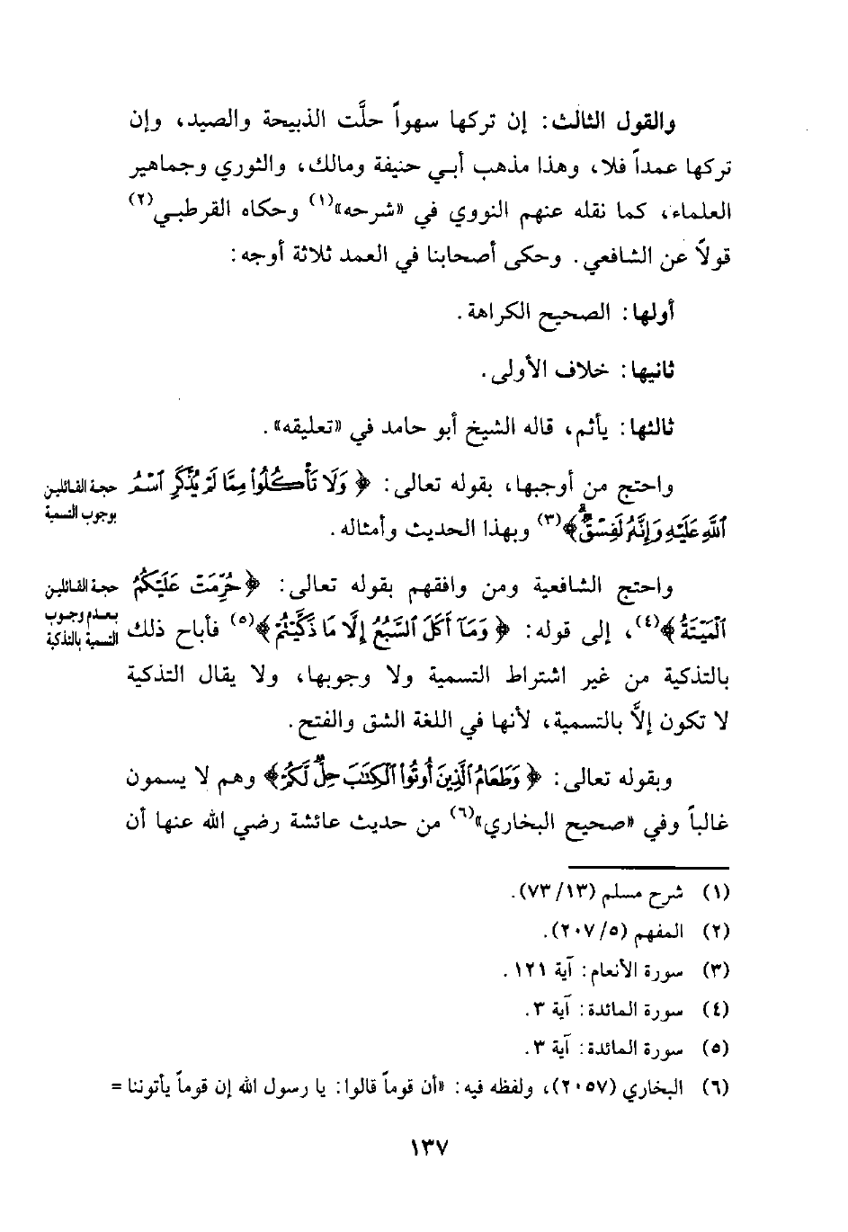 والقول الثالث: إن تركها سهوًا حلَّت الذبيحة والصيد, وإن تركها عمدًا فلا، وهذا مذهب أبي حنيفة ومالك، والثوري وجماهير العلماء، كما نقله عنهم النووي في "شرحه" (¬1) وحكاه القرطبي (¬2) قولًا عن الشافعي. وحكى أصحابنا في العمد ثلاثة أوجه: