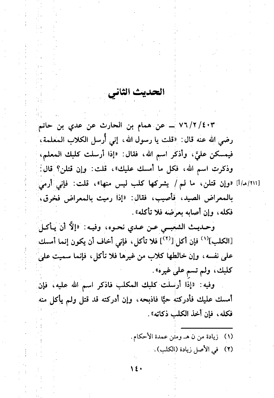 403/ 2/76 - عن همام بن الحارث عن عدي بن حاتم رضي الله عنه قال: "قلت يا رسول الله، إنى أُرسل الكلاب المعلمة، فيمسكن عليَّ، وأذكر اسم الله، فقال: "إذا أرسلت كلبك المعلم، وذكرت اسم الله، فكل ما أمسك عليك"، قلت: وإن قتلن؟ قال: "وإن قتلن، ما لم يشركها كلب ليس منها"، قلت: فإني أرمي بالمعراض الصيد، فأصيب، فقال: "إذا رميت بالمعراض فخرق، فكله، وإن أصابه بعرضه فلا تأكلها".