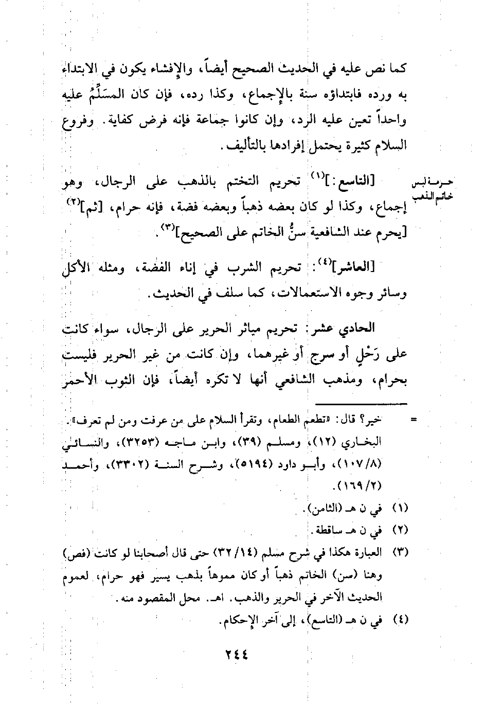(¬3) العبارة هكذا في شرح مسلم (14/ 32) حتى قال أصحابنا لو كانت (فص) وهنا (سن) الخاتم ذهبًا أو كان مموهًا بذهب يسير فهو حرام، لعموم الحديث الآخر في الحرير والذهب. اهـ. محل المقصود منه.