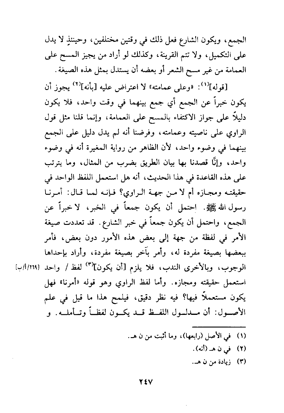 [قوله] (¬1): "وعلى عمامته" لا اعتراض عليه [بأنه] (¬2) يجوز أن يكون خبرًا عن الجمع أي جمع بينهما في وقت واحد، فلا يكون دليلًا على جواز الاكتفاء بالمسح على العمامة، وإنما قلنا مثل قول الراوي على ناصيته وعمامته، وفرضنا أنه لم يدل دليل على الجمع بينهما في وضوء واحد, لأن الظاهر من رواية المغيرة أنه في وضوء واحد، وإنَّا قصدنا بها بيان الطريق بضرب من المثال، وما يترتب على هذه القاعدة في هذا الحديث، أنه هل استعمل اللفظ الواحد في حقيقته ومجازه أم لا من جهة الراوي؟ فإنه لما قال: أمرنا رسول الله - صلي الله عليه وسلم -. احتمل أن يكون جمعًا في الخبر، لا خبرًا عن الجمع، واحتمل أن يكون جمعًا في خبر الشارع. قد تعددت صيغة الأمر في لفظة من جهة إلى بعض هذه الأمور دون بعض، فأمر ببعضها بصيغة مفردة له، وأمر بآخر بصيغة مفردة، وأراد بإحداها الوجوب، وبالأخرى الندب، فلا يلزم [أن يكون] (¬3) لفظ واحد استعمل حقيقته ومجازه. وأما لفظ الراوي وهو قوله "أمرنا" فهل يكون مستعملًا فيها؟ فيه نظر دقيق، فيلمح هذا ما قيل في علم الأصول: أن مدلول اللفظ قد يكون لفظًا وتأمله.