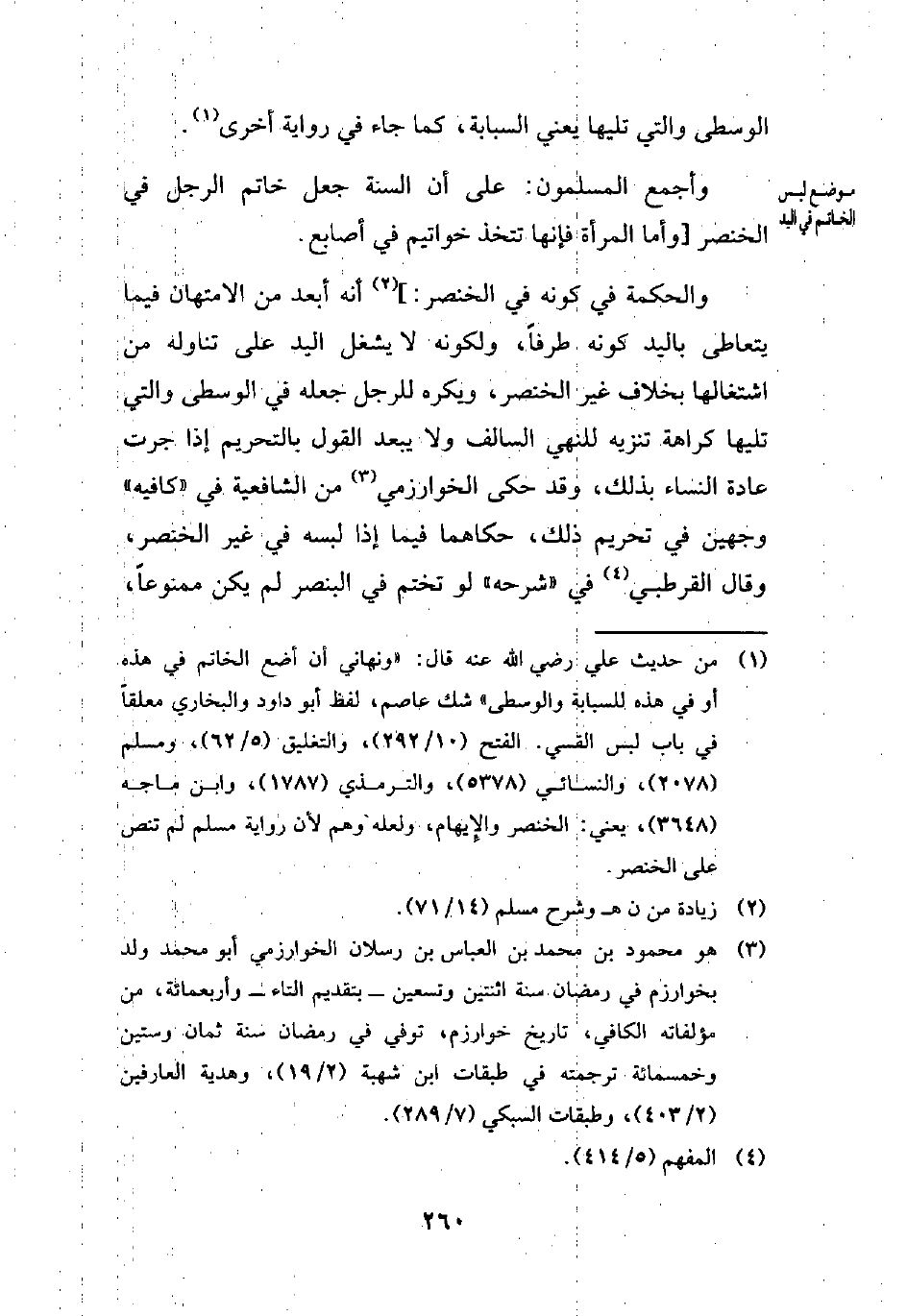 (¬1) من حديث علي رضي الله عنه قال: "ونهاني أن أضع الخاتم في هذه أو في هذه للسبابة والوسطى" شك عاصم، لفظ أبو داود والبخاري معلقًا في باب لبس القسي. الفتح (10/ 292)، والتغليق (5/ 62)، ومسلم (2078)، والنسائي (5378)، والترمذي (7187)، وابن ماجه (3648)، يعني: الخنصر والإِبهام، ولعله وهم لأن رواية مسلم لم تنص على الخنصر.