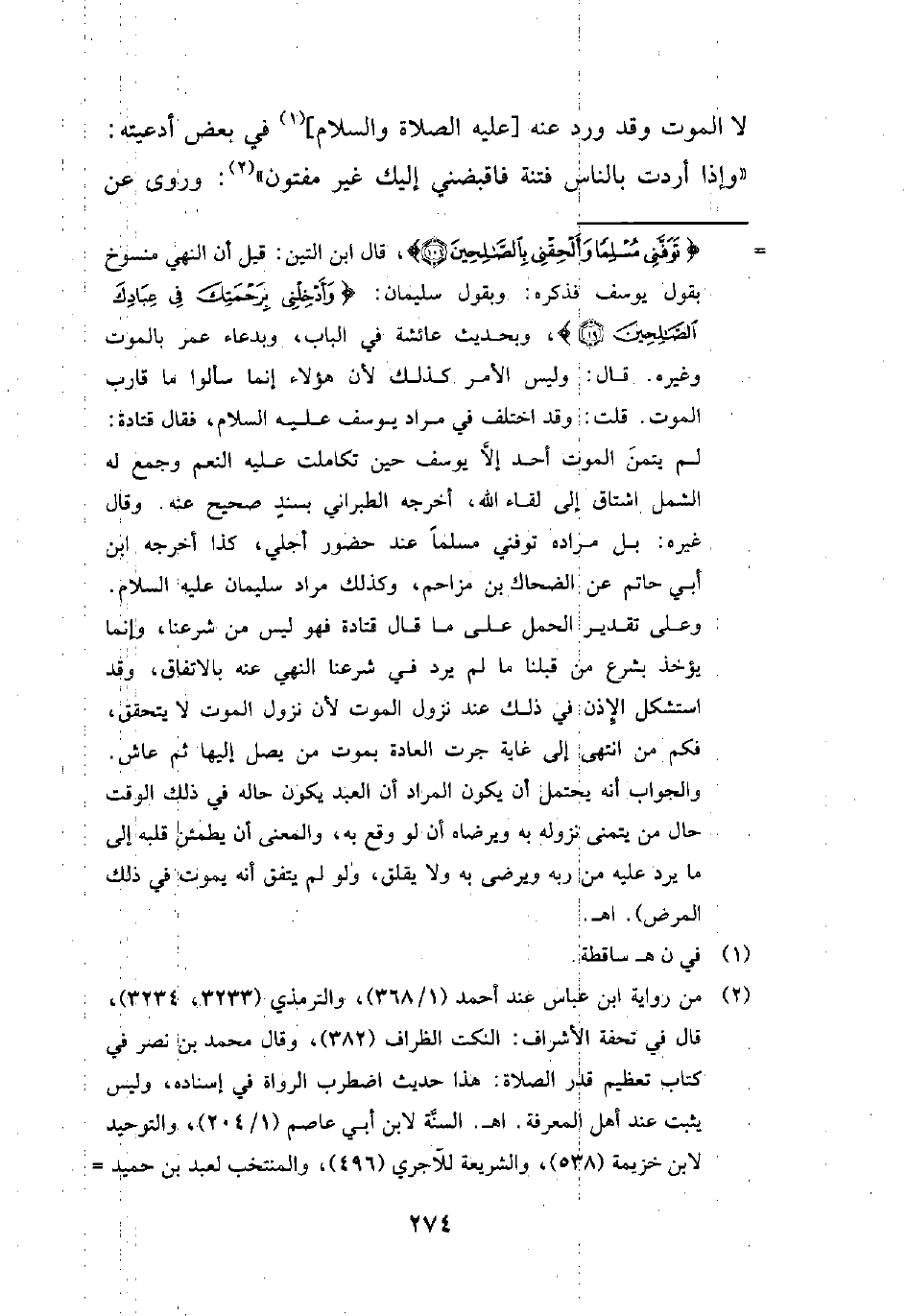 = {تَوَفَّنِي مُسْلِمًا وَأَلْحِقْنِي بِالصَّالِحِينَ (101)}، قال ابن التين: قيل أن النهي منسوخ بقول يوسف فذكره: وبقول سليمان: {وَأَدْخِلْنِي بِرَحْمَتِكَ فِي عِبَادِكَ الصَّالِحِينَ}، وبحديث عائشة في الباب، وبدعاء عمر بالموت وغيره. قال: وليس الأمر كذلك لأن هؤلاء إنما سألوا ما قارب الموت. قلت: وقد اختلف في مراد يوسف عليه السلام، فقال قتادة: لم يتمن الموت أحد إلَّا يوسف حين تكاملت عليه النعم وجمع له الشمل اشتاق إلى لقاء الله، أخرجه الطبراني بسندٍ صحيح عنه. وقال غيره: بل مراده توفني مسلمًا عند حضور أجلي، كذا أخرجه ابن أبي حاتم عن الضحاك بن مزاحم، وكذلك مراد سليمان عليه السلام.