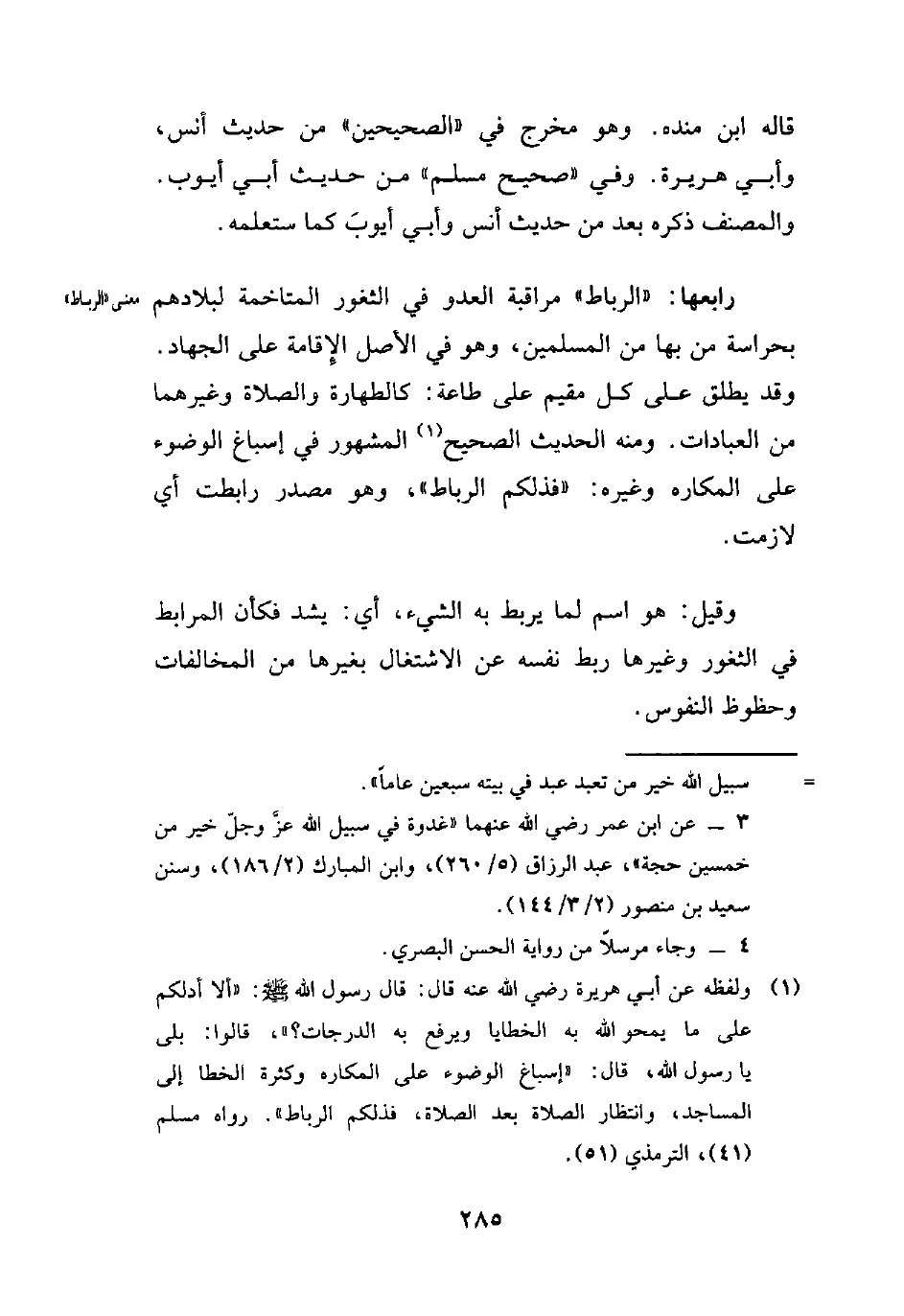رابعها: "الرباط" مراقبة العدو في الثغور المتاخمة لبلادهم بحراسة من بها من المسلمين، وهو في الأصل الإِقامة على الجهاد. وقد يطلق على كل مقيم على طاعة: كالطهارة والصلاة وغيرهما من العبادات. ومنه الحديث الصحيح (¬1) المشهور في إسباغ الوضوء على المكاره وغيره: "فذلكم الرباط"، وهو مصدر رابطت أي لا زمت.