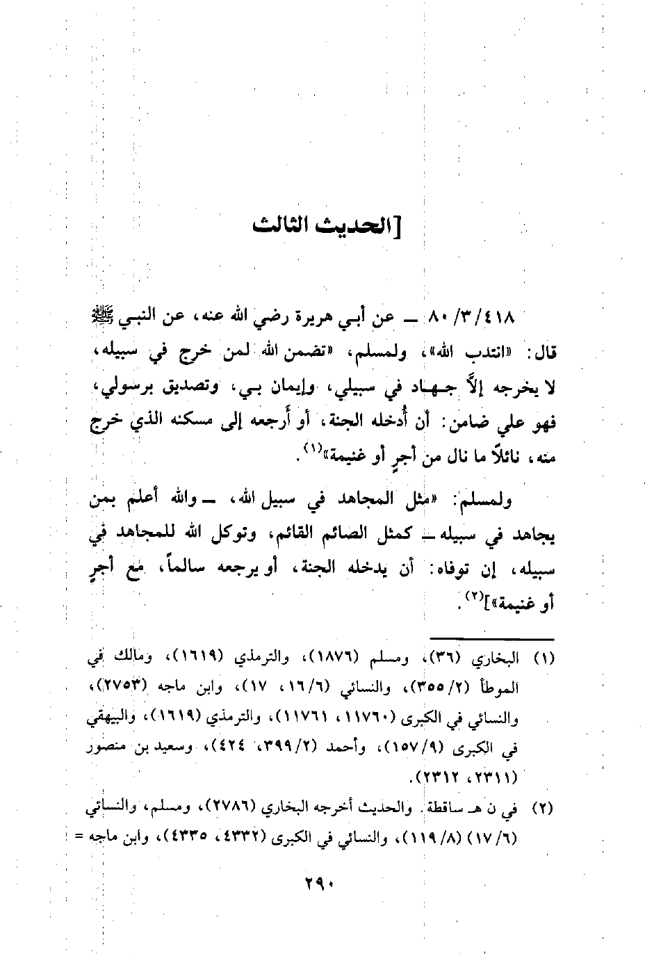 418/ 3/ 80 - عن أبي هريرة رضي الله عنه، عن النبي - صلى الله عليه وسلم - قال: "انتدب الله"، ولمسلم، "تضمن الله لمن خرج في سبيله، لا يخرجه إلَّا جهاد في سبيلي، وإيمان بي، وتصديق برسولي، فهو علي ضامن: أن أُدخله الجنة، أو أَرجعه إلى مسكنه الذي خرج منه، نائلًا ما نال أجرٍ أو غنيمة" (¬1).