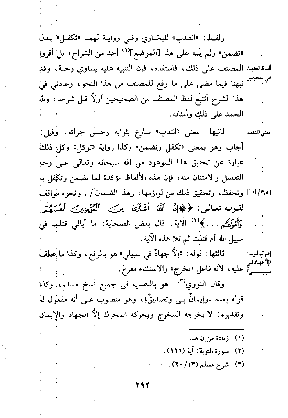 ثانيها: معنى "انتدب" سارع بثوابه وحسن جزائه. وقيل: أجاب وهو بمعنى "تكفل وتضمن" وكذا رواية "توكل" وكل ذلك عبارة عن تحقيق هذا الموعود من الله سبحانه وتعالى على وجه التفضل والامتنان منه، فإن هذه الألفاظ مؤكدة لما تضمن وتكفل به وتحفظ، وتحقيق ذلك من لوازمها، وهذا الضمان. ونحوه مواقف في لقوله تعالى: {إِنَّ اللَّهَ اشْتَرَى مِنَ الْمُؤْمِنِينَ أَنْفُسَهُمْ وَأَمْوَالَهُمْ ...} (¬2) الآية. قال بعض الصحابة: ما أبالي قتلت في سبيل الله أم قتلت ثم تلا هذه الآية.