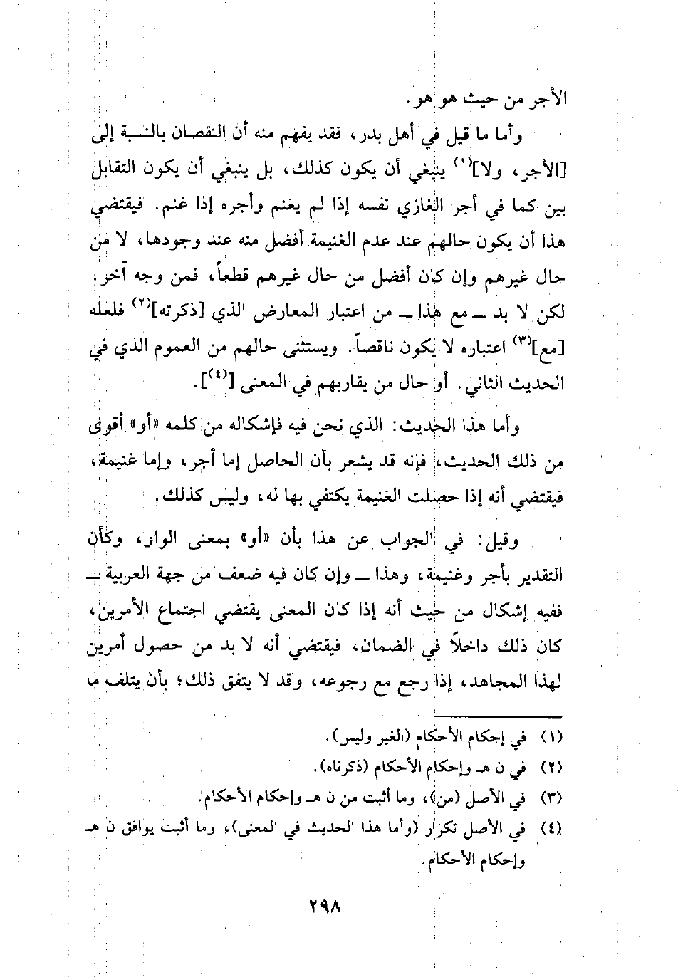 بين كما في أجر المغازي نفسه إذا لم يغنم وأجره إذا غنم. فيقتضي هذا أن يكون حالهم عند عدم الغنيمة أفضل منه عند وجودها, لا من حال غيرهم وإن كان أفضل من حال غيرهم قطعًا، فمن وجه آخر. لكن لا بد -مع هذا- من اعتبار المعارض الذي [ذكرته] (¬2) فلعله [مع] (¬3) اعتباره لا يكون ناقصًا. ويستثنى حالهم من العموم الذي في الحديث الثاني. أو حال من يقاربهم في المعنى [(¬4)].