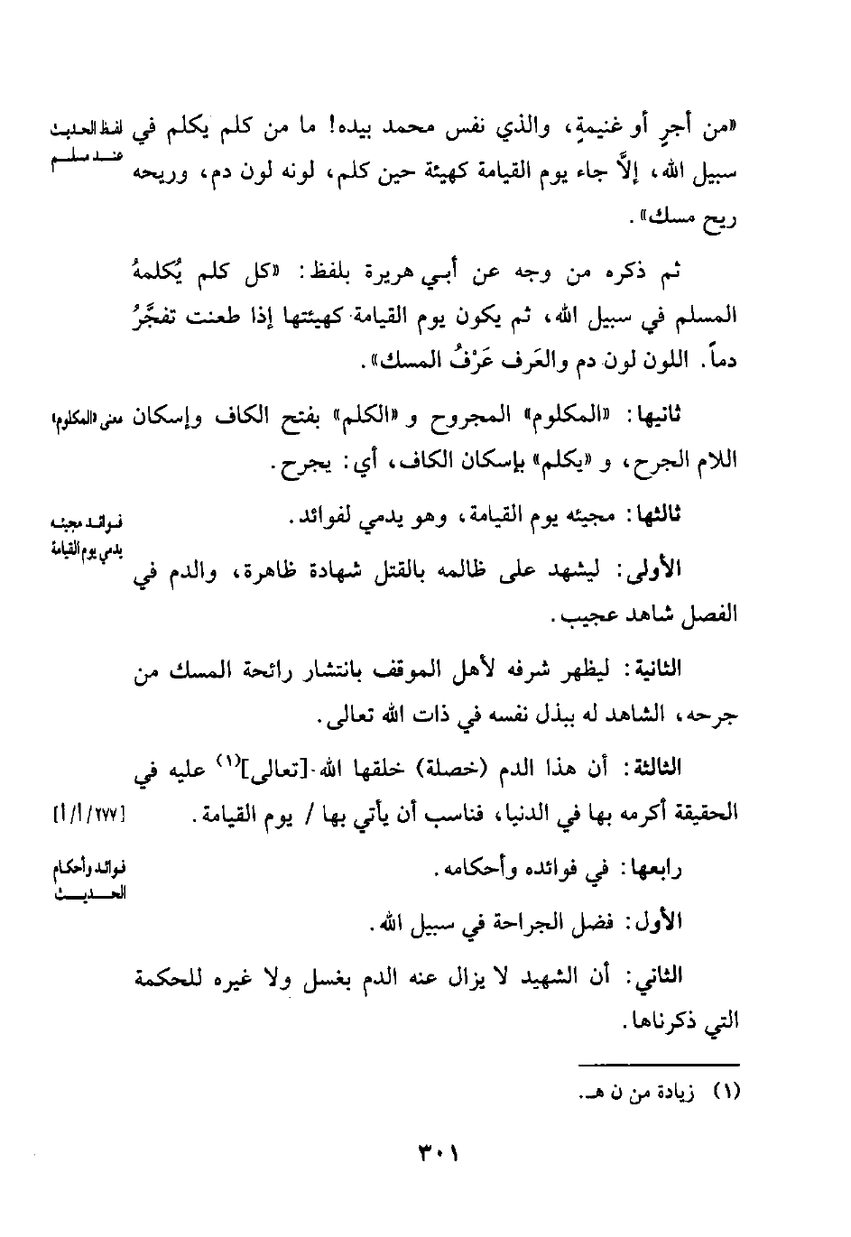 الثانية: ليظهر شرفه لأهل الموقف بانتشار رائحة المسك من جرحه، الشاهد له ببذل نفسه في ذات الله تعالى.