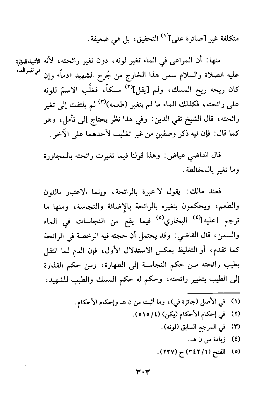 فعند مالك: يقول لا عبرة بالرائحة، وإنما الاعتبار باللون والطعم، ويحكمون بنغيره بالرائحة بالإِضافة والنجاسة، ومنها ما ترجم [عليه] (¬4) البخاري (¬5) فيما يقع من النجاسات في الماء والسمن، قال القاضي: وقد يحتمل أن حجته فيه الرخصة في الرائحة كما تقدم، أو التغليظ بعكس الاستدلال الأول، فإن الدم لما انتقل بطيب رائحته من حكم النجاسة إلى الطهارة، ومن حكم القذارة إلى الطيب بتغيير رائحته، وحكم له حكم المسك والطيب للشهيد،
