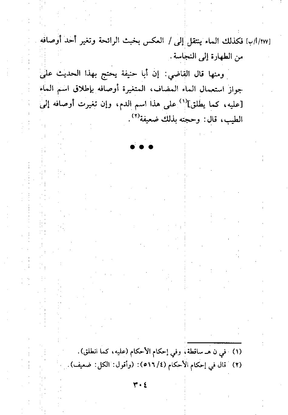 ومنها قال القاضي: إن أبا حنيقة يحتج بهذا الحديث على جواز استعمال الماء المضاف، المتغيرة أوصافه بإطلاق اسم الماء [عليه، كما يطلق] (¬1) على هذا اسم الدم، وإن تغيرت أوصافه إلى الطيب، قال: وحجته بذلك ضعيفة (¬2).