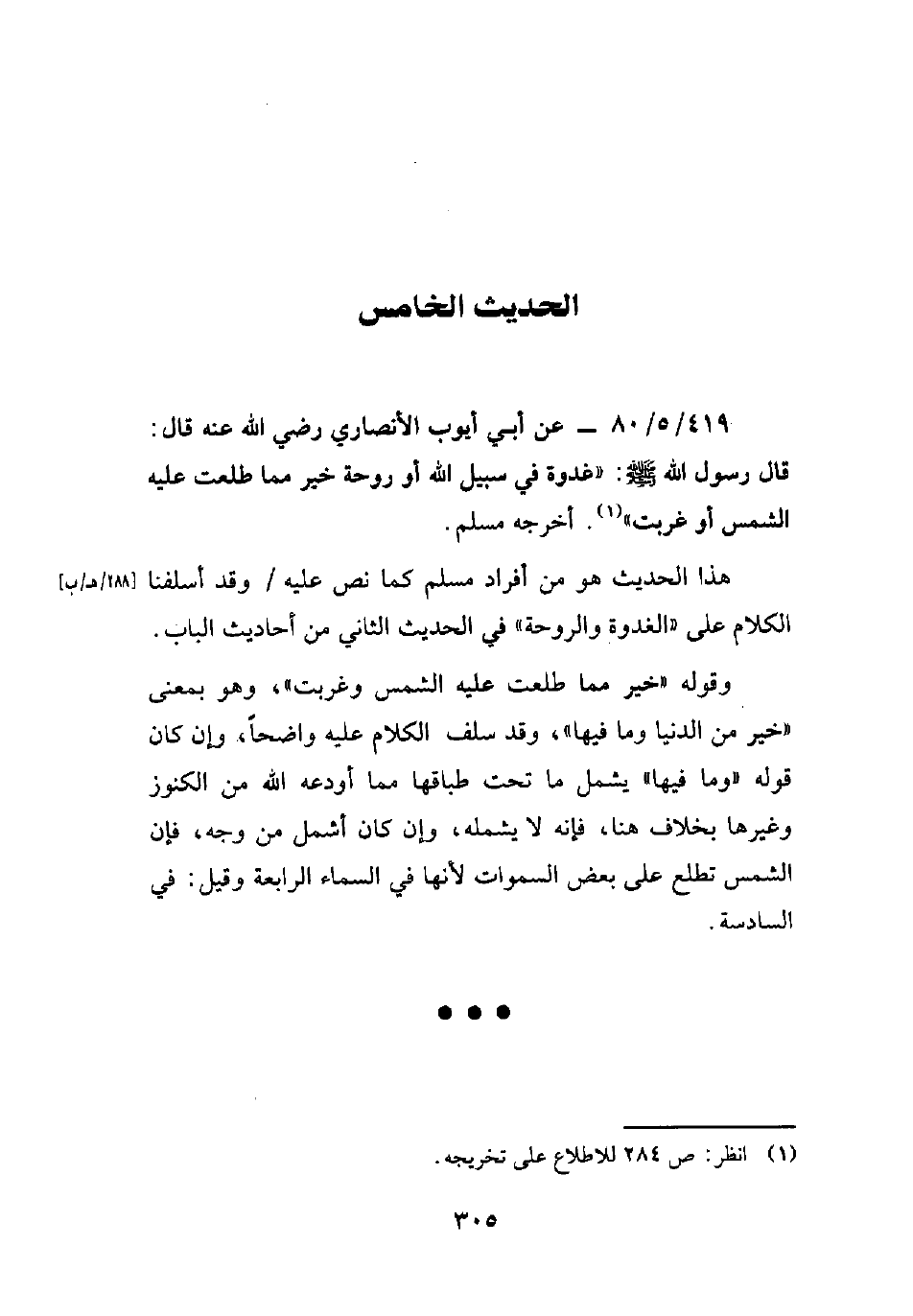 419/ 5/ 80 - عن أبي أيوب الأنصاري رضي الله عنه قال: قال رسول الله - صلي الله عليه وسلم -: "غدوة في سبيل الله أو روحة خير مما طلعت عليه الشمس أو غربت" (¬1). أخرجه مسلم.