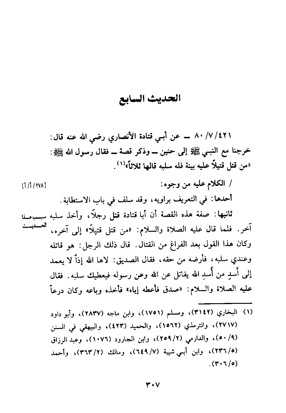 421/ 7/ 80 - عن أبي قتادة الأنصاري رضي الله عنه قال: خرجنا مع النبي - صلي الله عليه وسلم - إلى حنين -وذكر قصة - فقال رسول الله -صلي الله عليه وسلم -: "من قتل قتيلًا عليه بينة فله سلبه قالها ثلاثًا" (¬1).