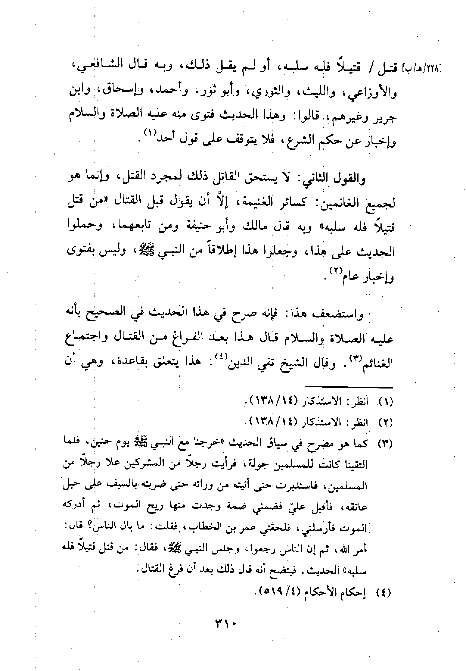 والقول الثاني: لا يستحق القاتل ذلك لمجرد القتل، وإنما هو لجميع الغانمين: كسائر الغنيمة، إلَّا أن يقول قبل القتال "من قتل قتيلًا فله سلبه" وبه قال مالك وأبو حنيفة ومن تابعهما، وحملوا الحديث على هذا، وجعلوا هذا إطلاقًا من النبي - صلي الله عليه وسلم -, وليس بفتوى وإخبار عام (¬2).
