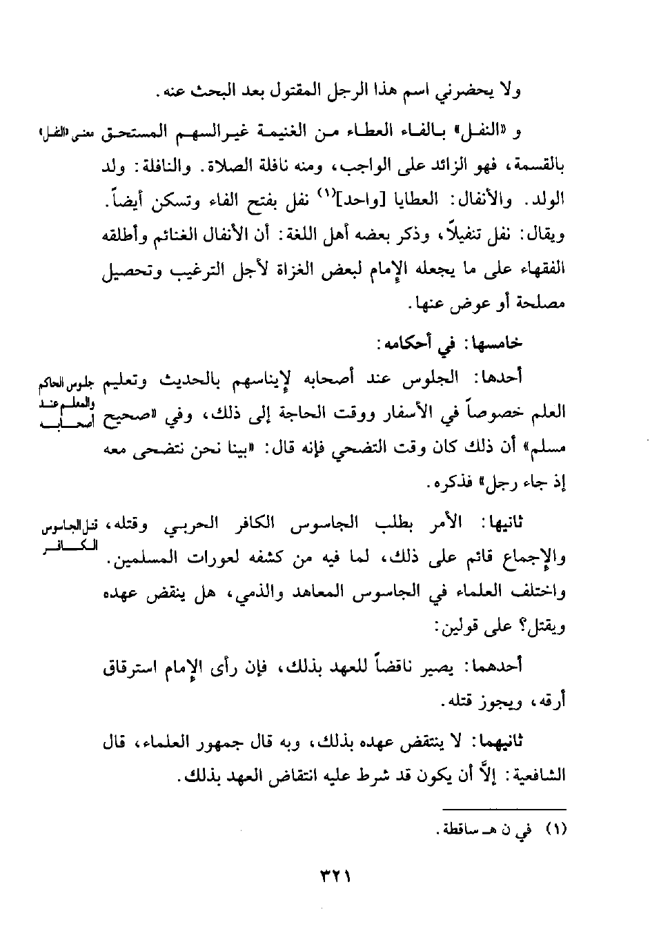 و"النفل" بالفاء العطاء من الغنيمة غير السهم المستحق بالقسمة، فهو الزائد على الواجب، ومنه نافلة الصلاة. والنافلة: ولد الولد. والأنفال: العطايا [واحد] (¬1) نفل بفتح الفاء وتسكن أيضًا. ويقال: نفل تنفيلًا، وذكر بعضه أهل اللغة: أن الأنفال الغنائم وأطلقه الفقهاء على ما يجعله الإِمام لبعض الغزاة لأجل الترغيب وتحصيل مصلحة أو عوض عنها.