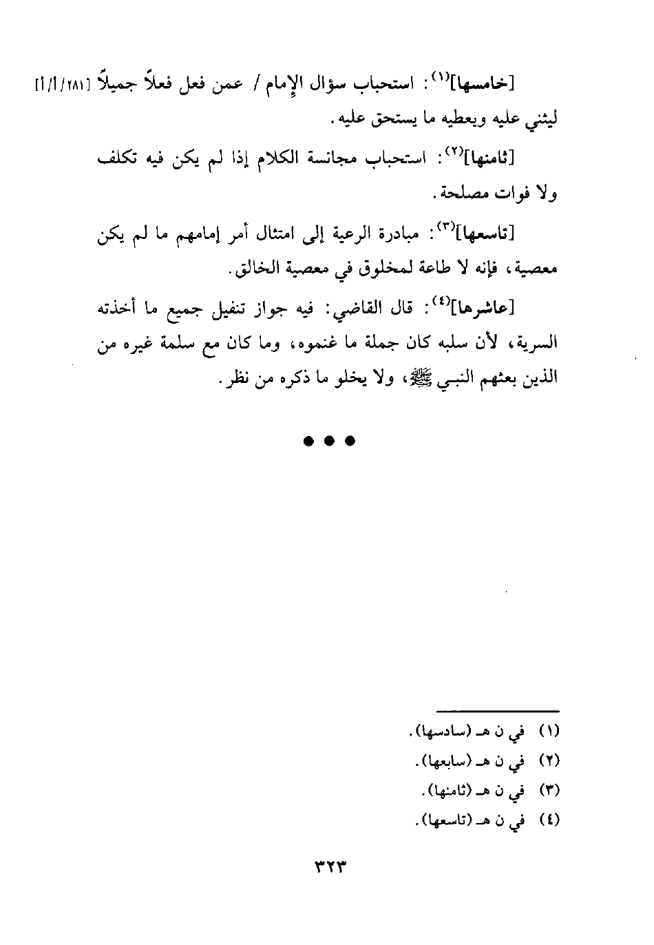 [تاسعها] (¬3): مبادرة الرعية إلى امتثال أمر إمامهم ما لم يكن معصية، فإنه لا طاعة لمخلوق في معصية الخالق.