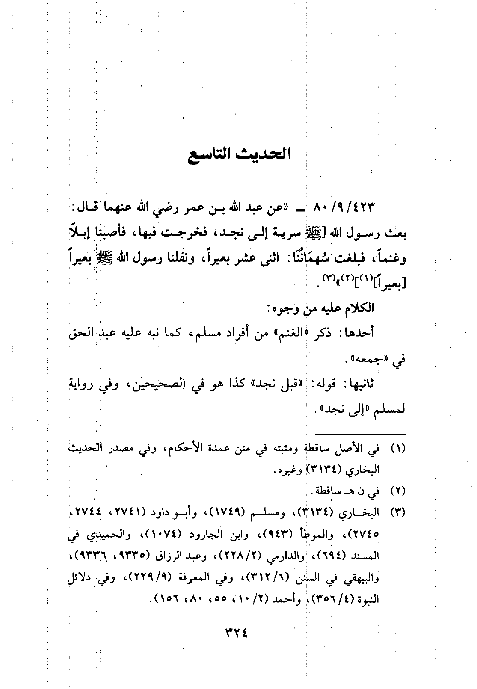 423/ 9/ 80 - " عن عبد الله بن عمر رضي الله عنهما قال: بعث رسول الله [- صلي الله عليه وسلم - سرية إلى نجد، فخرجت فيها، فأصبنا إبلًا وغنمًا، فبلغت سُهمَانُنَا: اثنى عشر بعيرًا، ونفلنا رسول الله - صلي الله عليه وسلم - بعيرًا [بعيرًا] (¬1)] (¬2) " (¬3).