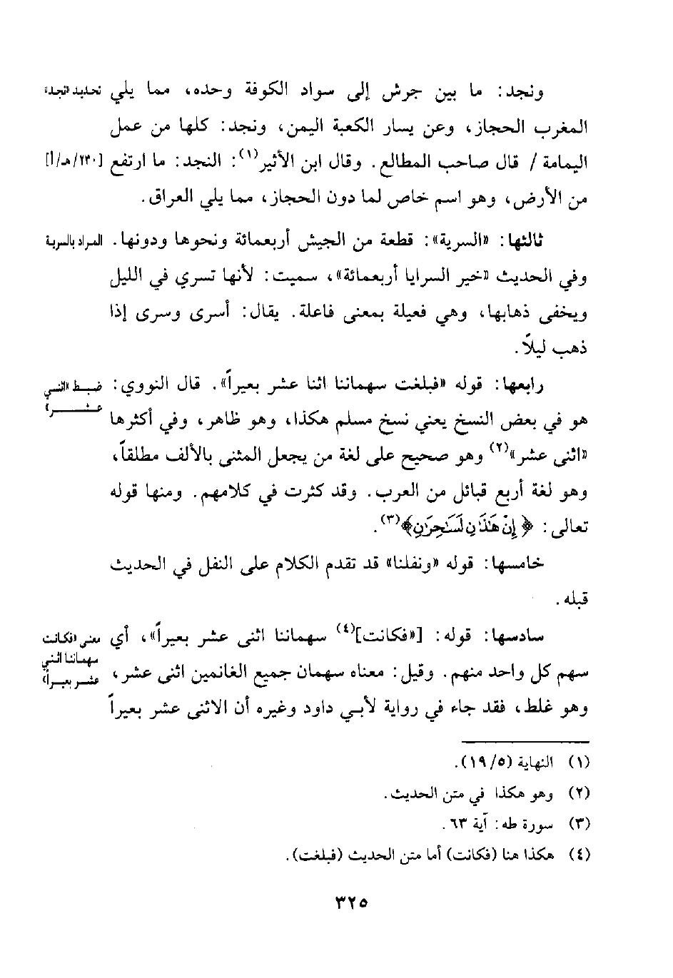 رابعها: قوله "فبلغت سهماننا اثنا عثر بعيرًا". قال النووي: هو في بعض النسخ يعني نسخ مسلم هكذا، وهو ظاهر، وفي أكثرها "اثنى عشر" (¬2) وهو صحيح على لغة من يجعل المثنى بالألف مطلقًا، وهو لغة أربع قبائل من العرب. وقد كثرت في كلامهم. ومنها قوله تعالى: {إِنْ هَذَانِ لَسَاحِرَانِ} (¬3).