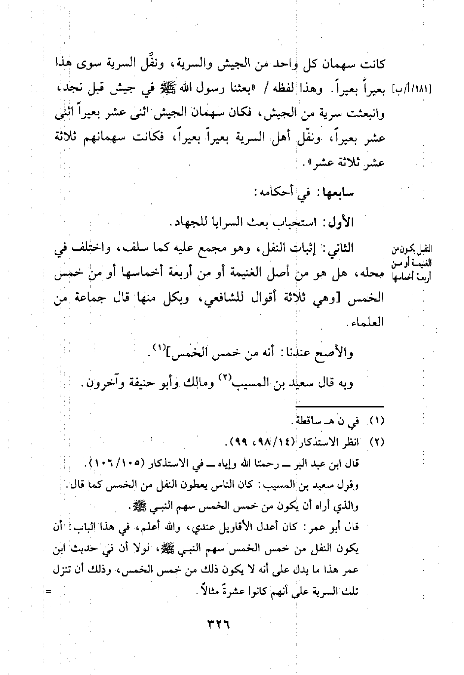 قال أبو عمر: كان أعدل الأقاويل عندي، والله أعلم، في هذا الباب: أن يكون النفل من خمس الخمس سهم النبي - صلي الله عليه وسلم -، لولا أن في حديث ابن عمر هذا ما يدل على أنه لا يكون ذلك من خمس الخمس، وذلك أن تنزل تلك السرية على أنهم كانوا كرة مثالًا. =